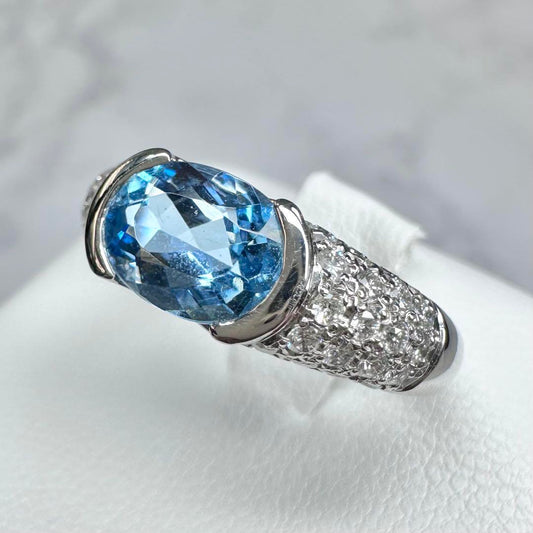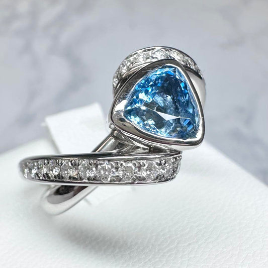 【美品】PT900アクアマリン トリリアント1.31ct ダイヤ リボンリング