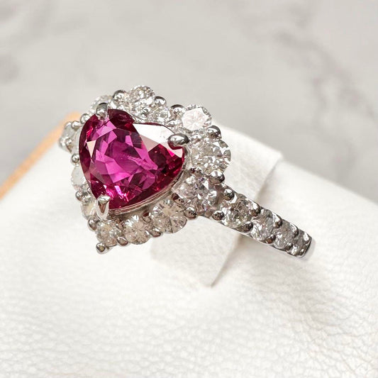【美品】PT900 ビルマ産ルビー1.06ct ハート ダイヤ巻きリング