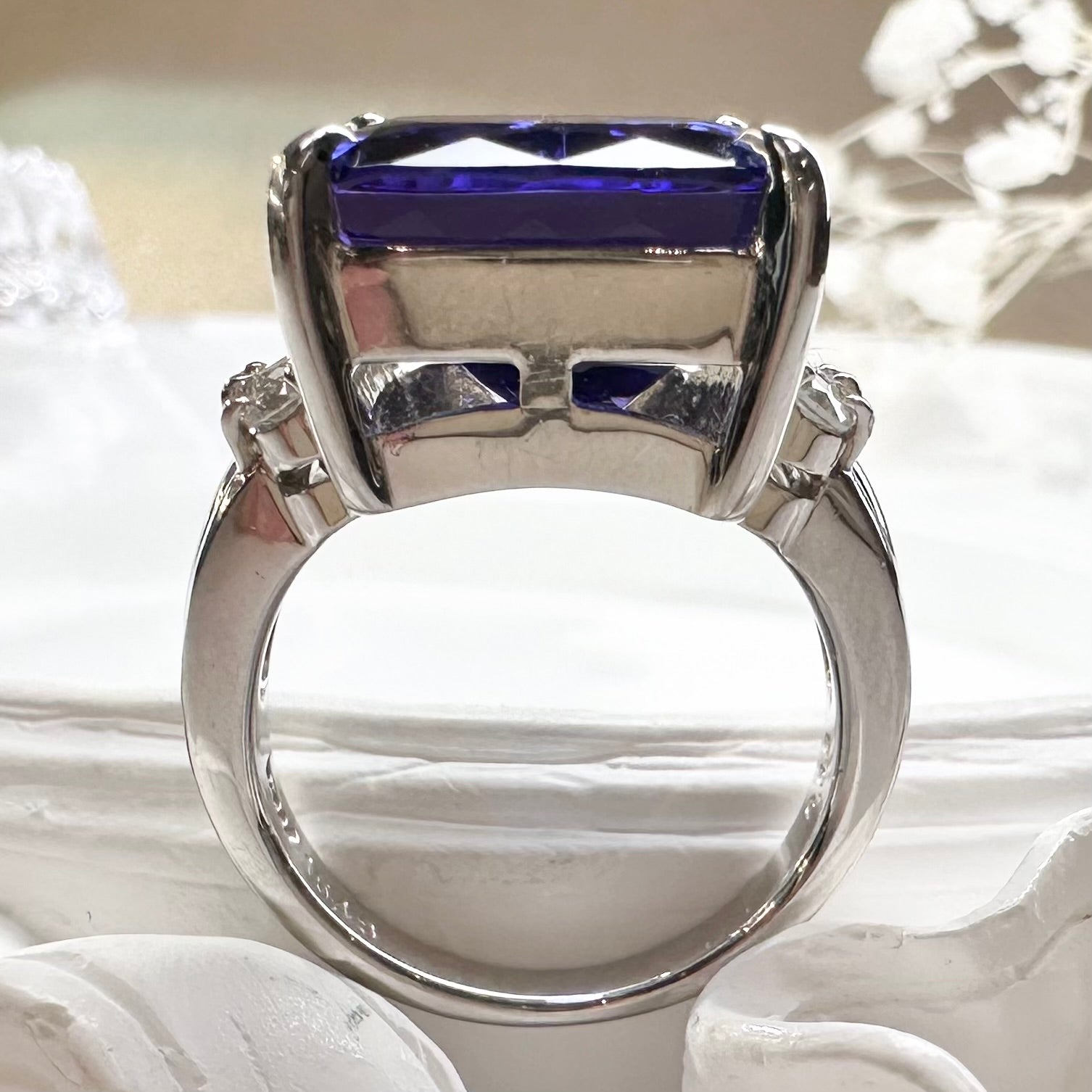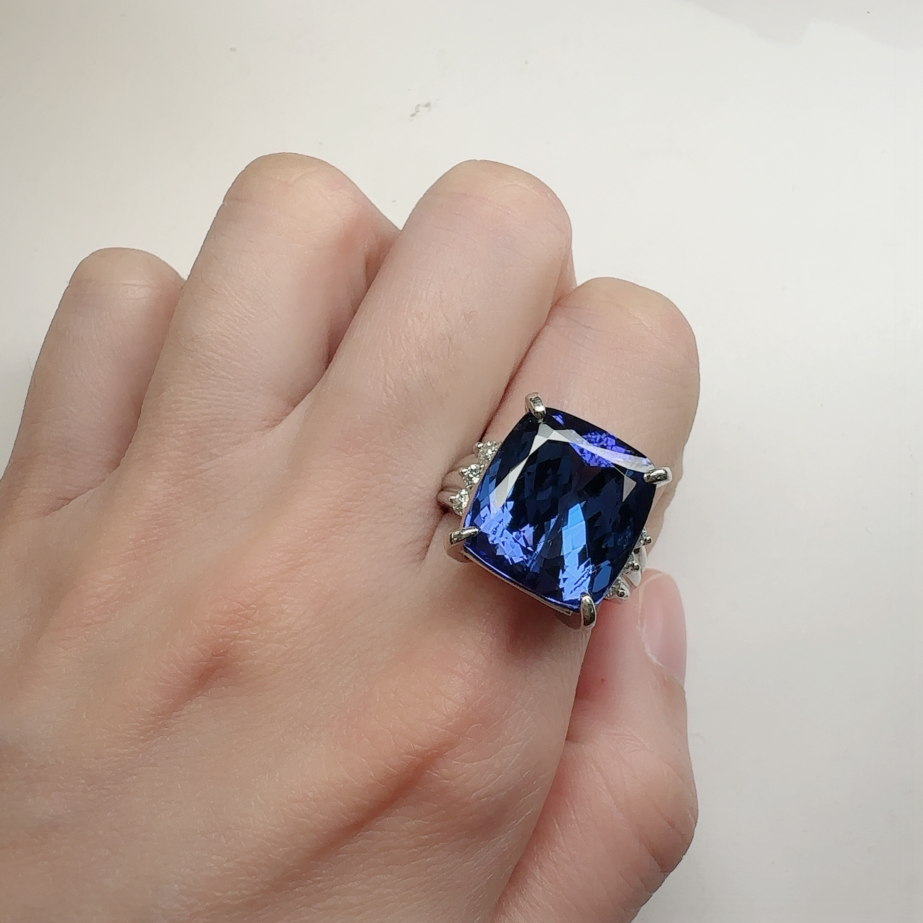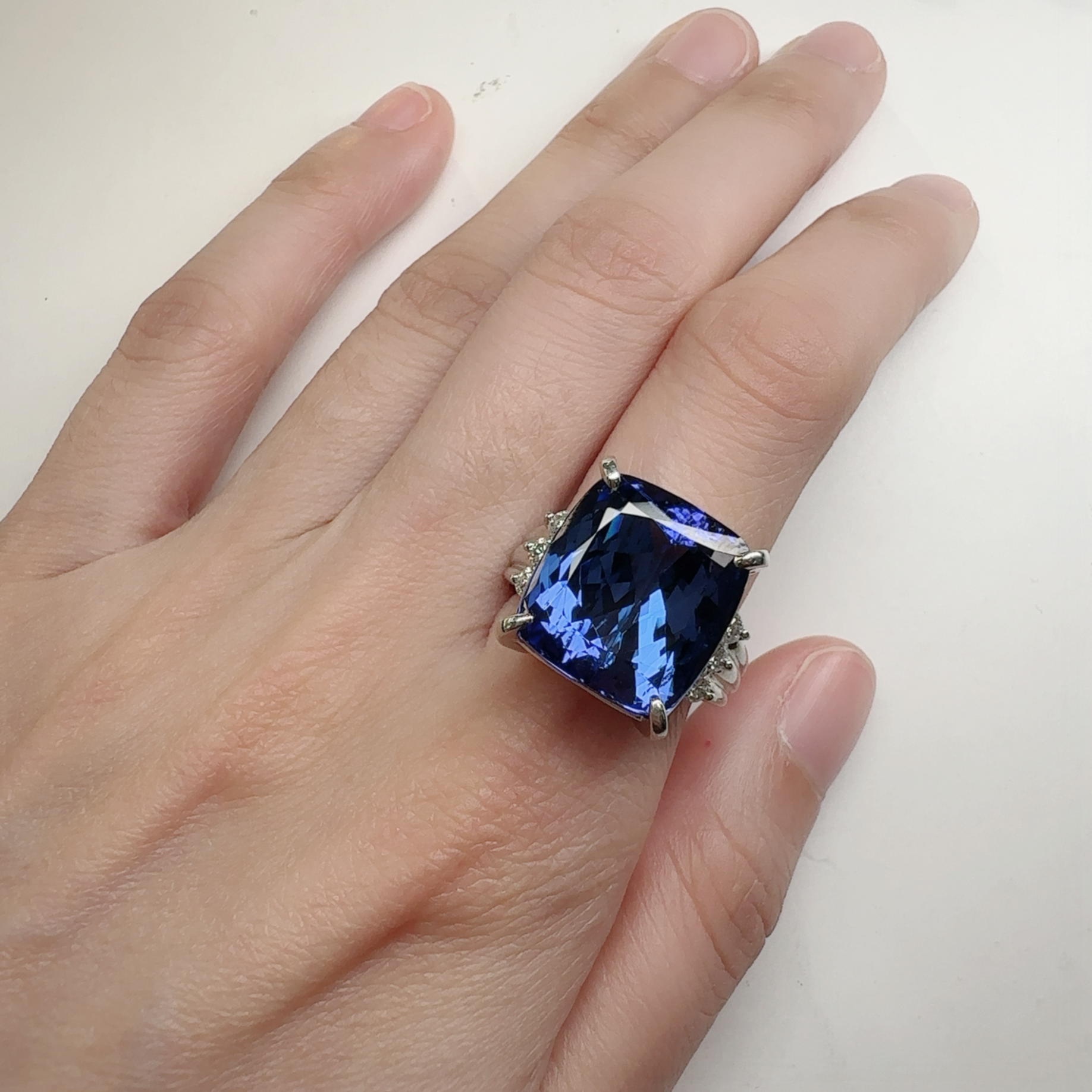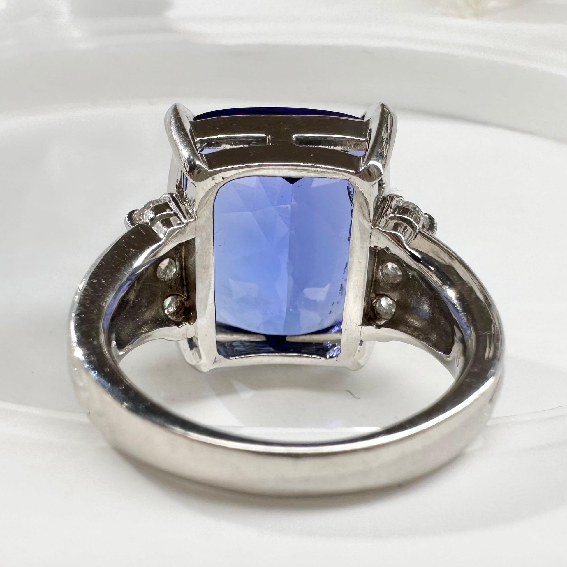 PT900枠にセッティングされたタンザナイトリングです。15.48ctの非常に大粒なタンザナイトは、深く濃厚なブルーとバイオレットの色調が美しく、角度によって豊かな表情を見せてくれます。存在感のあるクッションカットが主石の魅力を最大限に引き立て、気品と迫力を兼ね備えた一点。希少性の高い宝石をお探しの方や、コレクションジュエリーとしてもおすすめです。