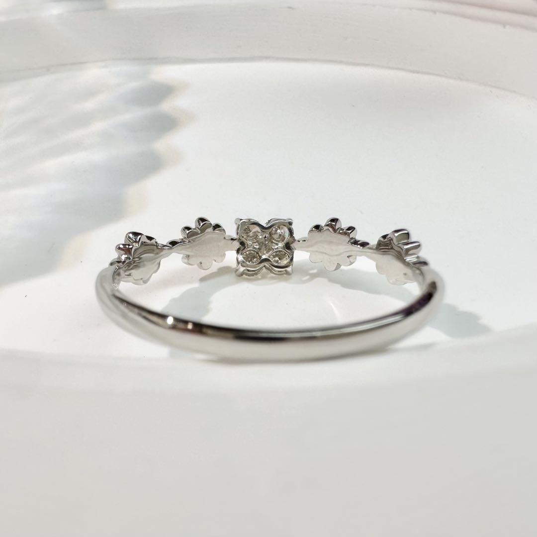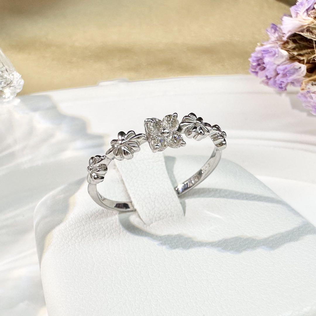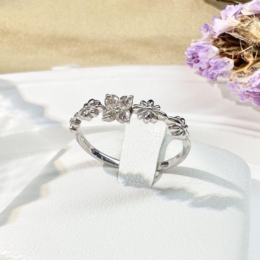 PT900プラチナに0.13カラットのダイヤモンドをセッティングしたリングです。中央のダイヤを小花モチーフで囲み、可憐で上品なデザインに仕上がっています。普段使いはもちろん、フォーマルな場にも映える華やかさがあり、手元を明るく彩ります。シンプルながらも個性を感じる逸品です。