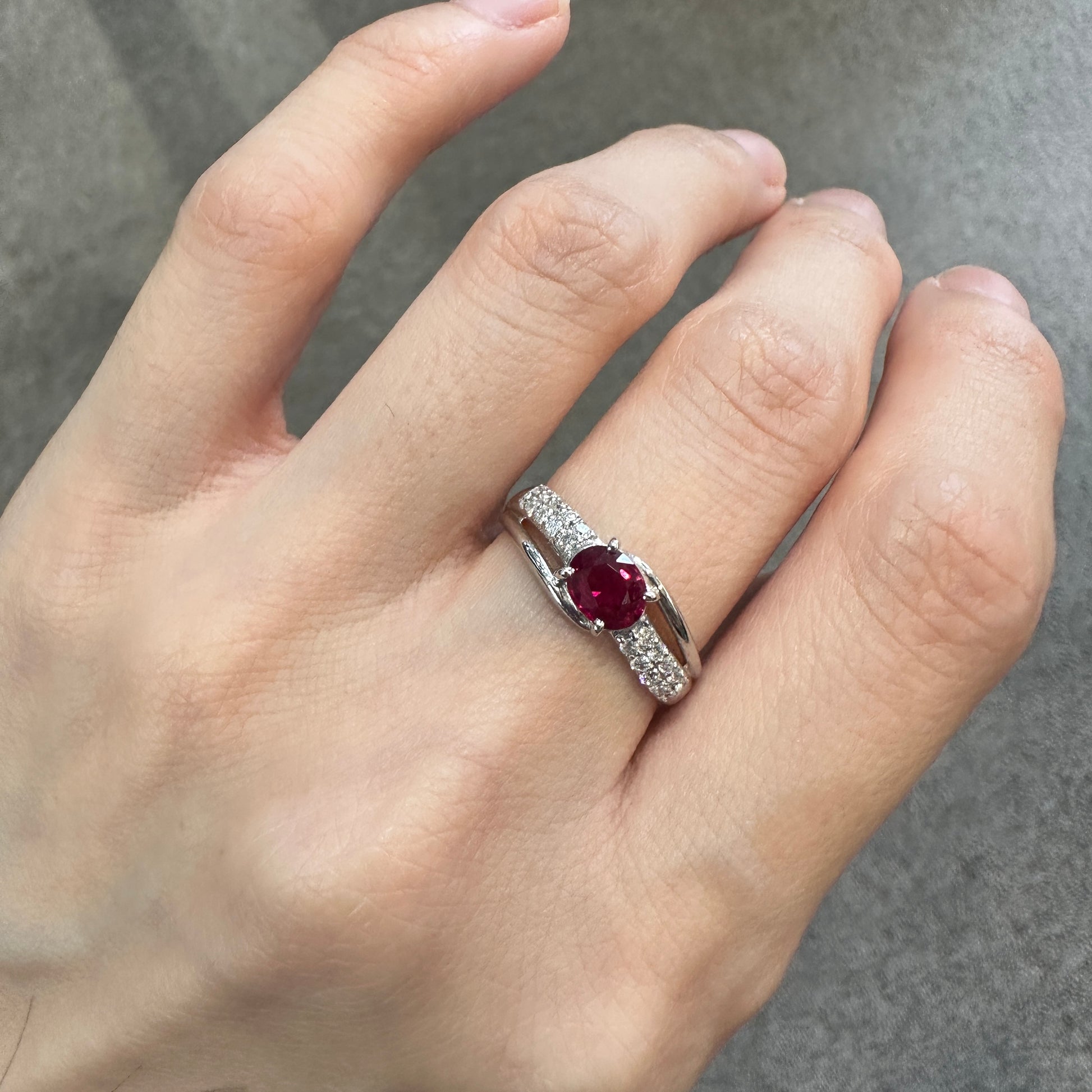 鮮やかで上質なルビーが輝く、プラチナ製のエレガントなリングです。両サイドにあしらわれたダイヤモンドが、ルビーの美しさをより一層引き立ててくれます。シンプルながらも高級感があり、フォーマルにも日常にもお使いいただけます。