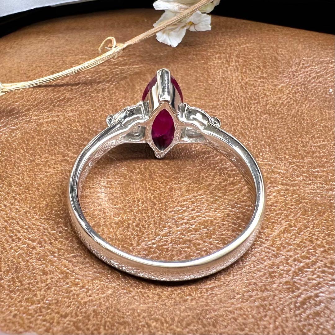 マーキスカットのルビーを主石に据えた、王道の三石スタイル。1960〜80年代にかけて流行した、石のフォルムを最大限に活かすエレガントなセッティングが特徴です。両脇に配されたダイヤモンドが縦のラインを強調し、指元をすっきりと美しく演出。華美に走らず、宝石そのものの存在感を重んじた、時代を超えて愛されるクラシックジュエリーです。