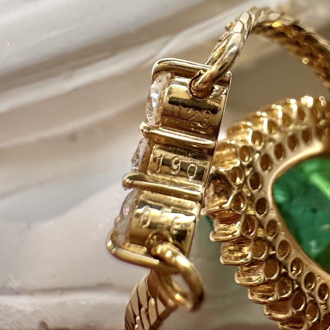 鮮やかなグリーンが美しいエメラルド(1.90ct)をメインに、繊細なダイヤモンドで取り巻いた豪華なK18ペンダントトップです。ペアシェイプのエメラルドは存在感があり、周囲のダイヤモンドが上品な輝きをプラス。クラシックでありながら華やかさも兼ね備えたデザインで、フォーマルから特別なシーンまで幅広くご愛用いただけます。上質なゴールドの輝きとエメラルドの鮮やかな発色が胸元を美しく彩る、特別感のあるジュエリーです。