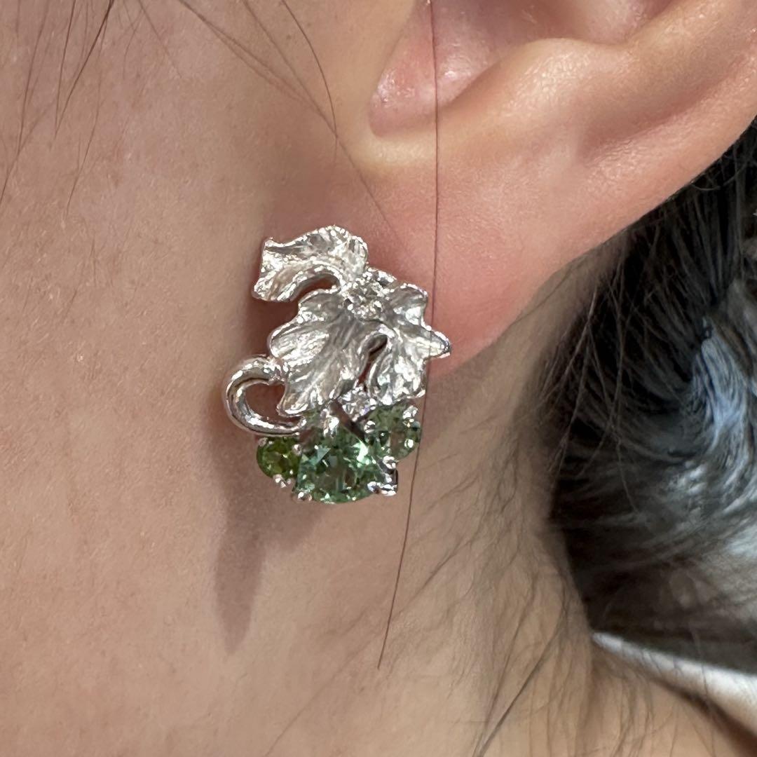 美しいグリーンカラーが魅力のK18トルマリンイヤリングです。左右で0.7ctと0.6ctの上質なトルマリンを使用し、自然のリーフを思わせる立体的なデザインが耳元を華やかに演出します。光の角度によってさまざまなグリーンの輝きを楽しめ、存在感がありながらも上品さを兼ね備えています。
