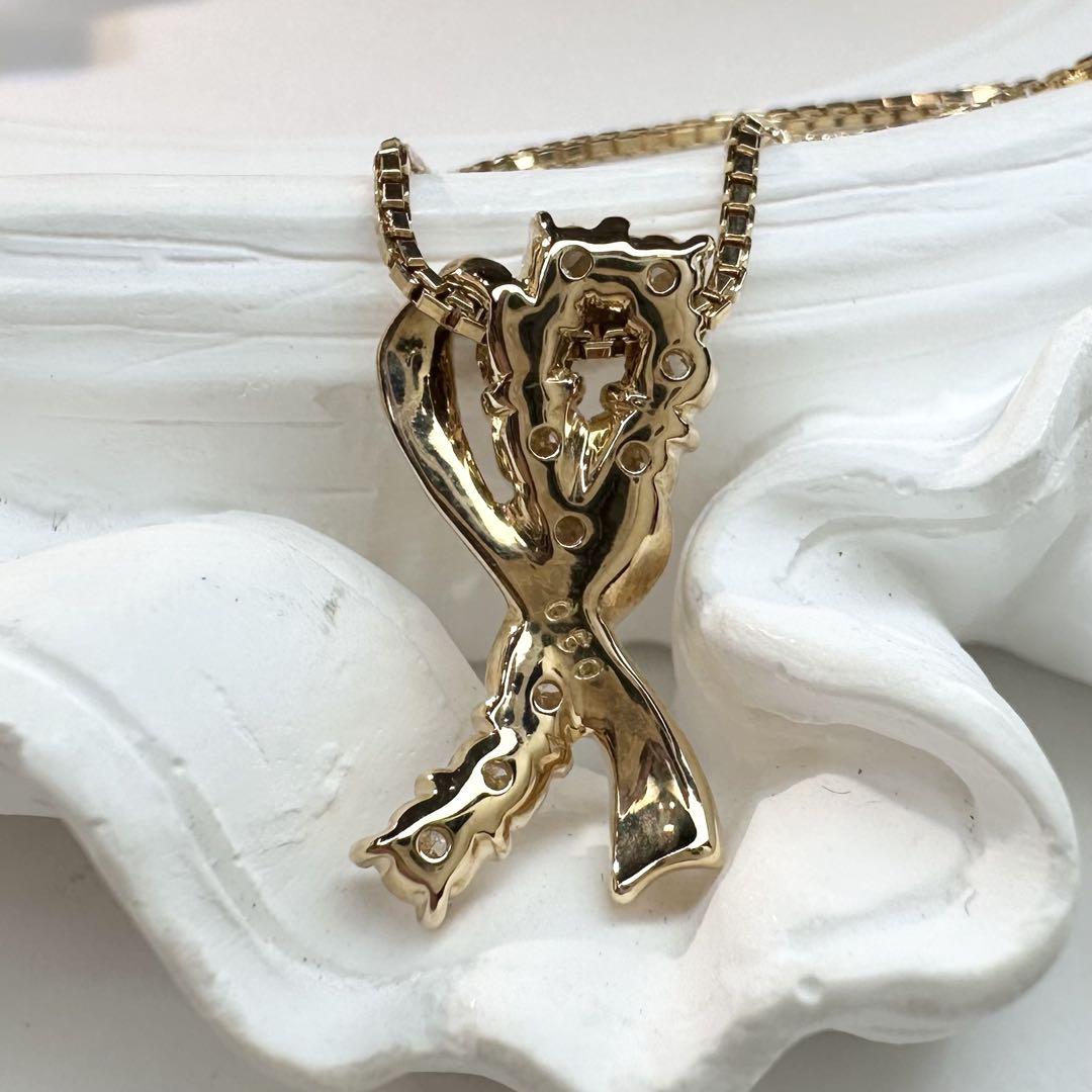 華やかで上品なデザインのK18イエローゴールド製ダイヤモンドネックレスです。立体的に流れるようなリボン&ハートモチーフに、合計0.50ctの上質なダイヤモンドが贅沢にセッティングされています。ダイヤモンドは透明感があり、キラキラと美しい輝きを放ちます。ゴールドの温かみとダイヤの煌めきが絶妙にマッチし、胸元を華やかに演出してくれる逸品です。普段使いはもちろん、特別な日のお出かけやギフトにも最適です。