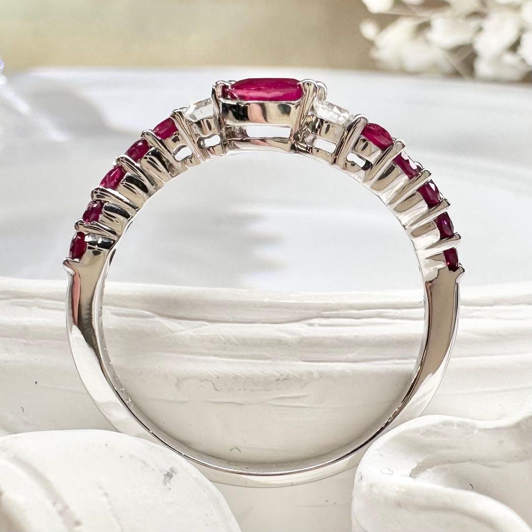 K18ホワイトゴールドを使用した、華やかで洗練されたルビーリングです。マーキスカットのルビーを中心に、両サイドにはダイヤモンドをあしらい、アーム部分にも美しいルビーをセッティング。深みのある赤色とダイヤモンドの輝きが指元を上品に演出します。存在感がありながらも日常使いしやすく、特別なシーンにもおすすめの一品です。