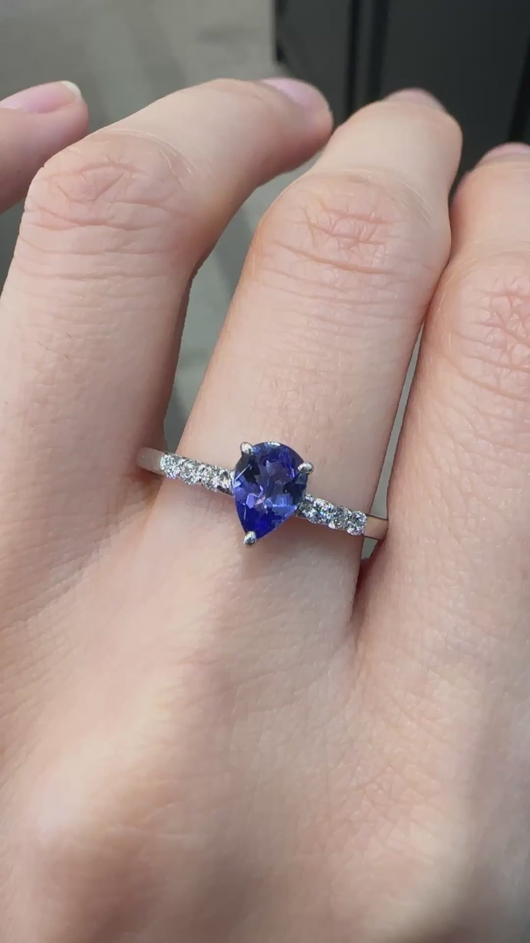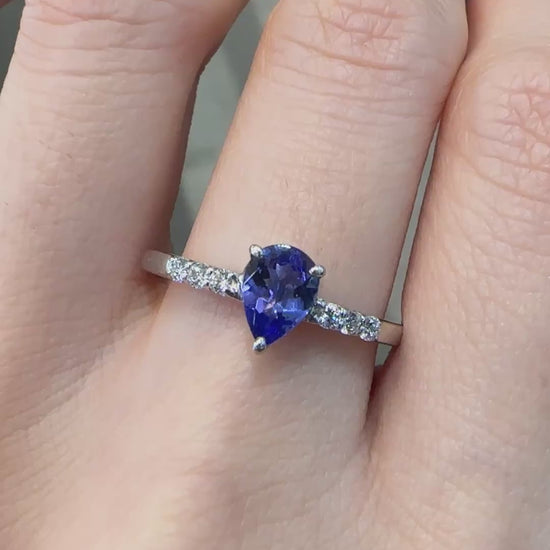 0.5ctのタンザナイトはペアシェイプカットで、見る角度によって青紫色に輝きます。