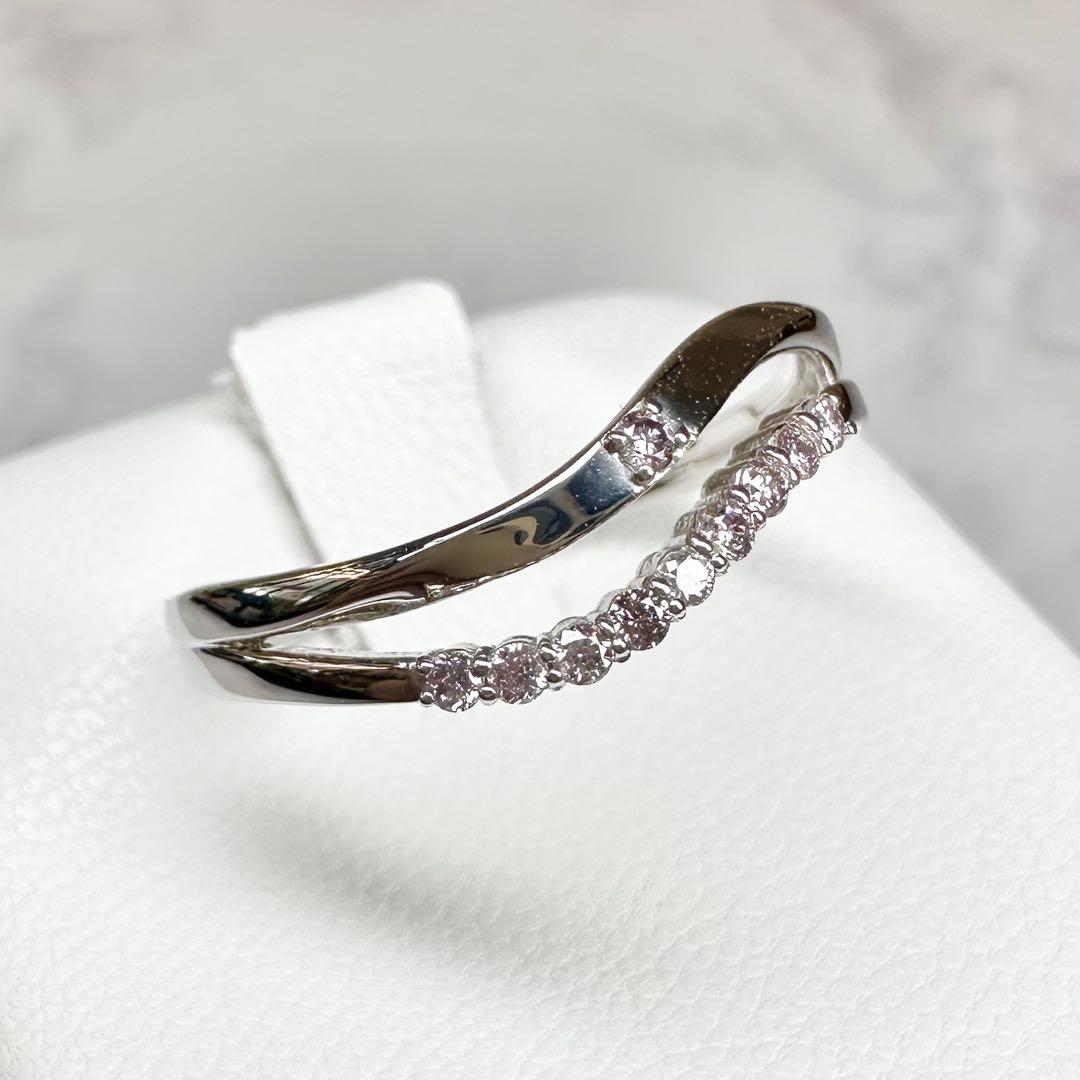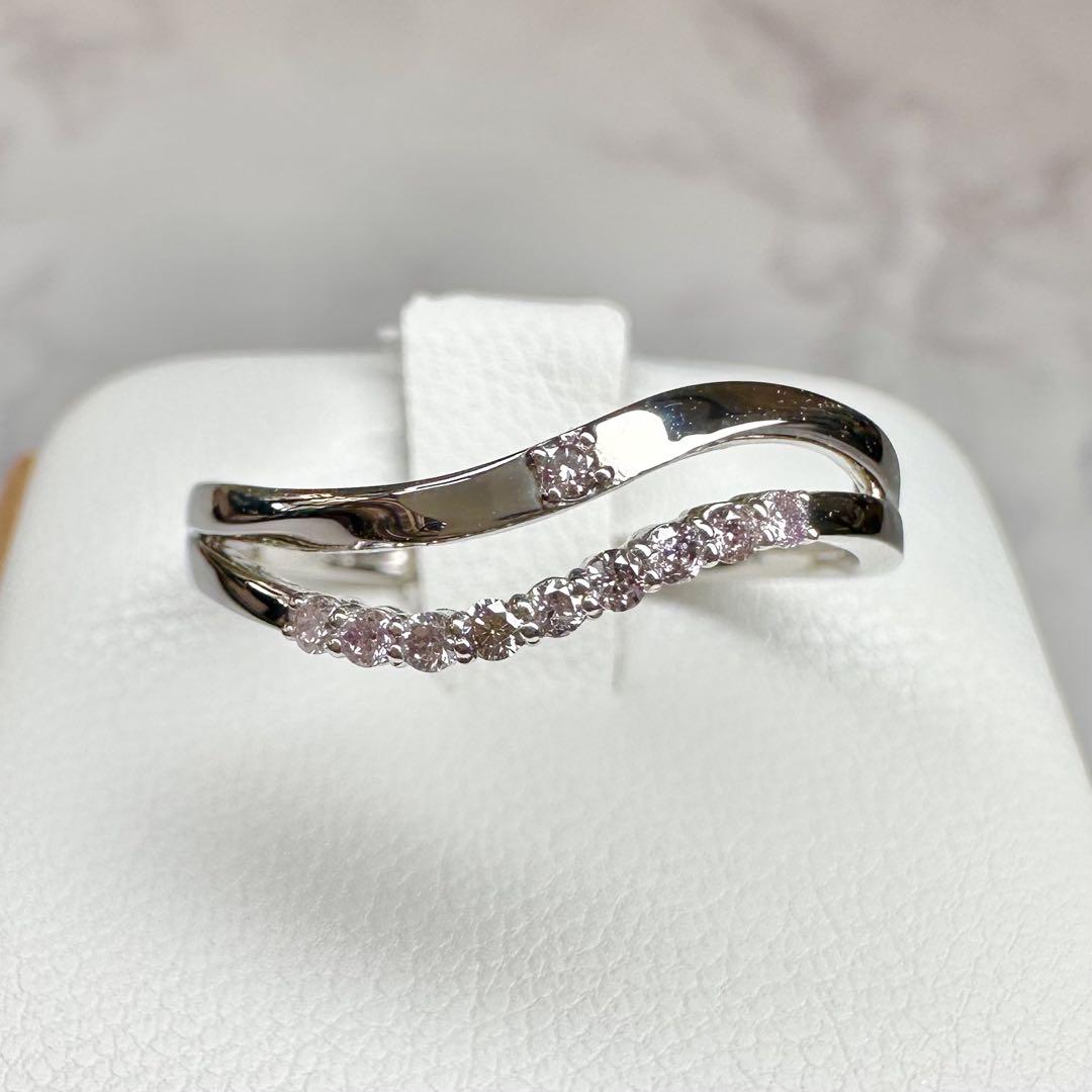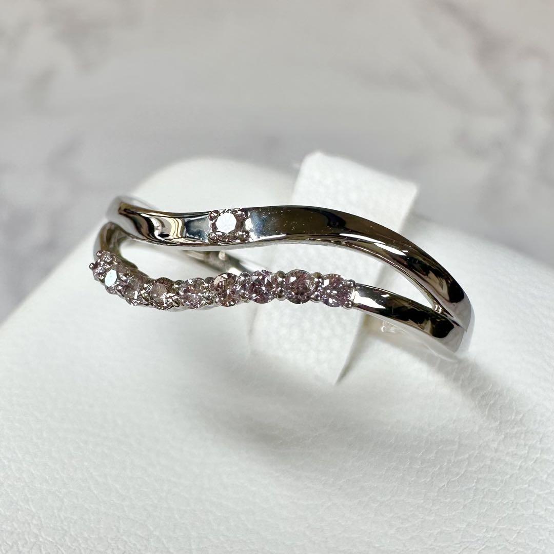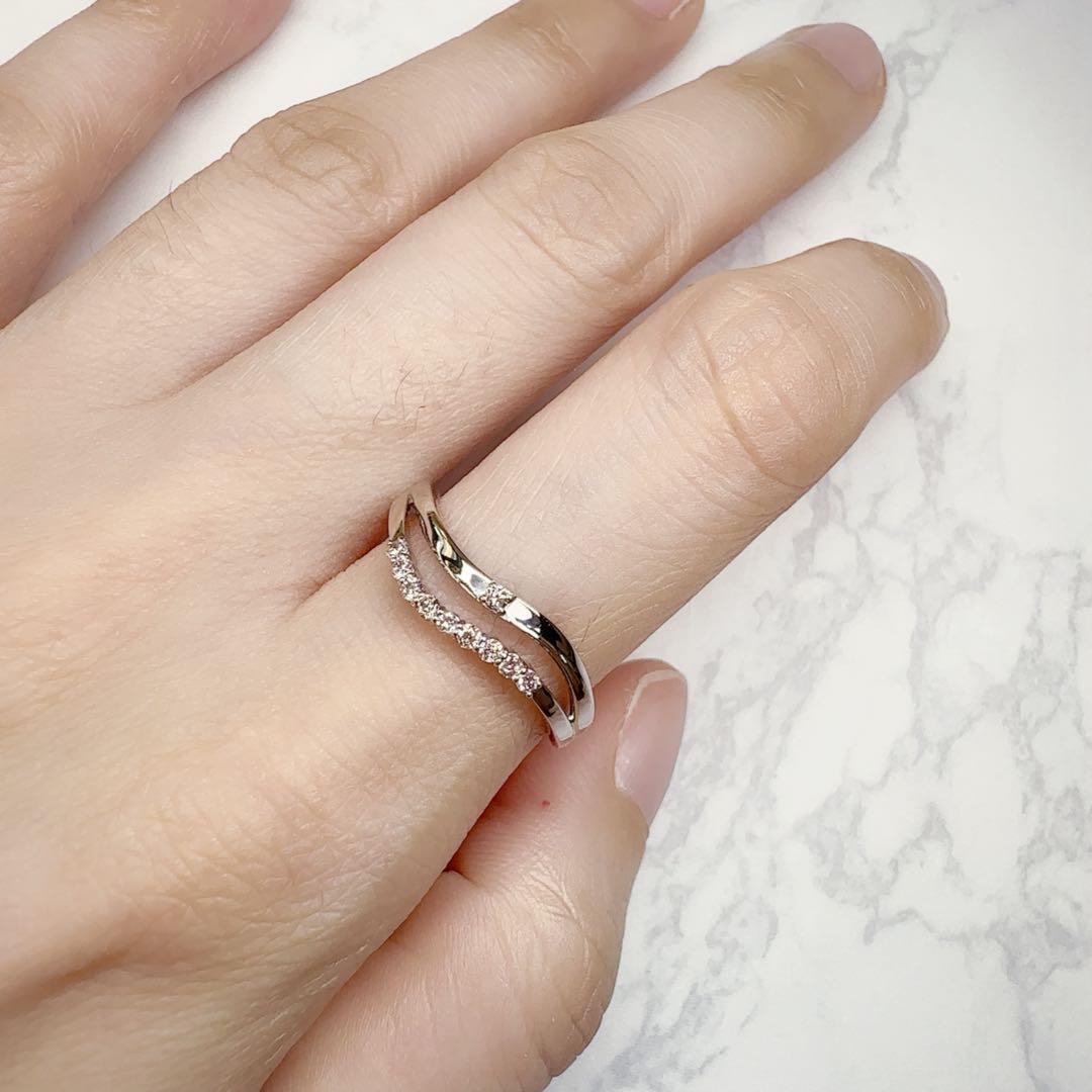 希少な天然ピンクダイヤモンドを贅沢に使用した、上品なウェーブデザインのプラチナリングです。PT900の高級感ある輝きに、やさしいピンクがさりげなく華を添えます。洗練された大人の女性にぴったりの一本。