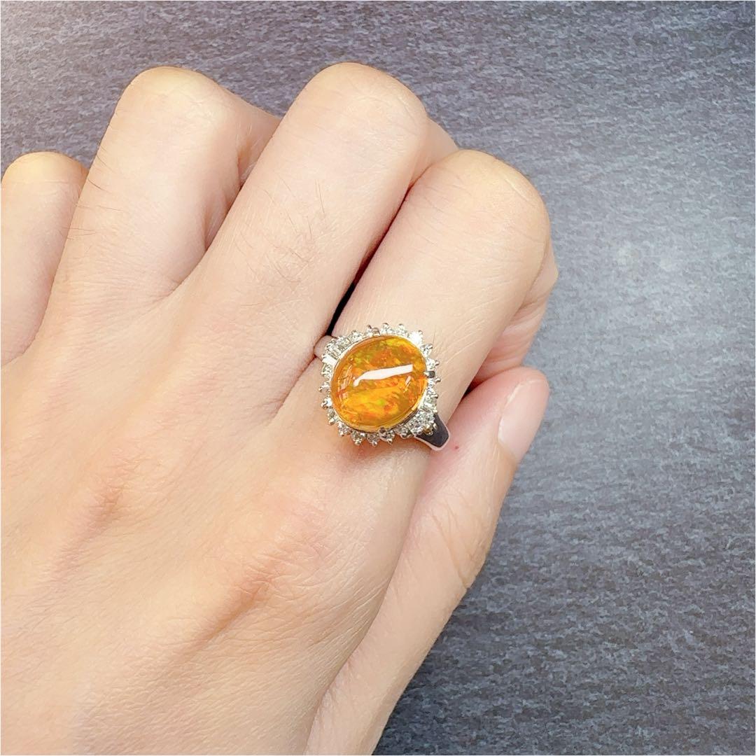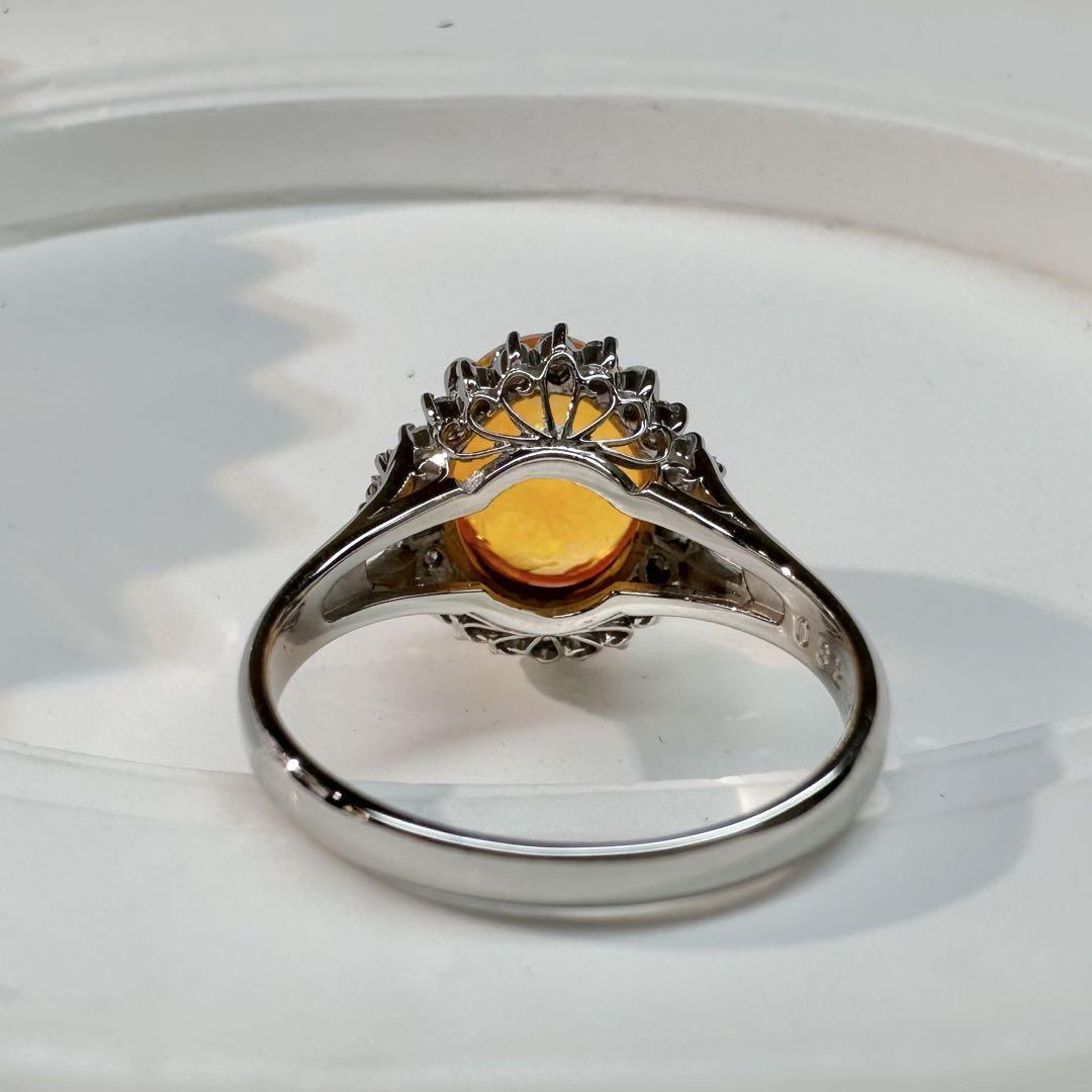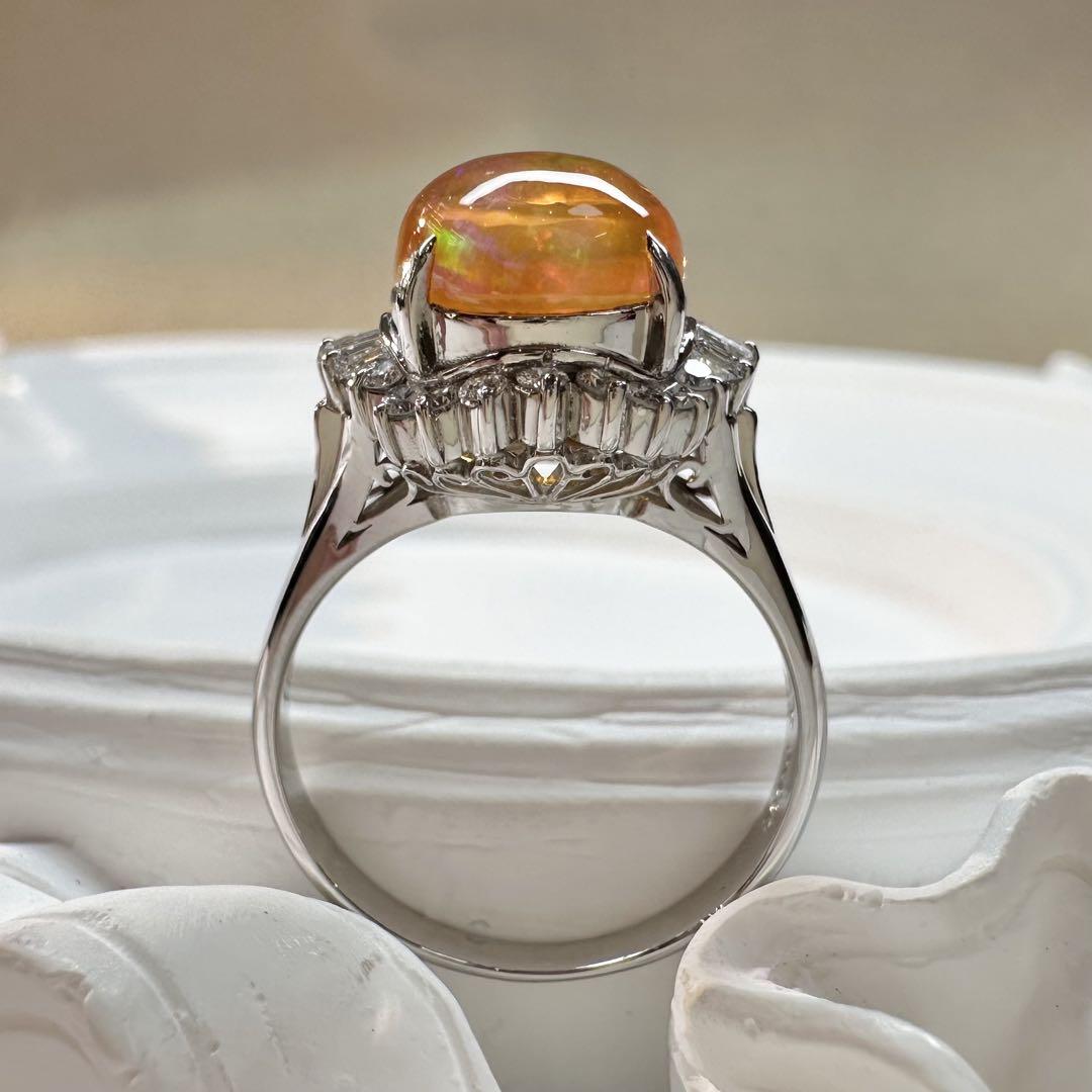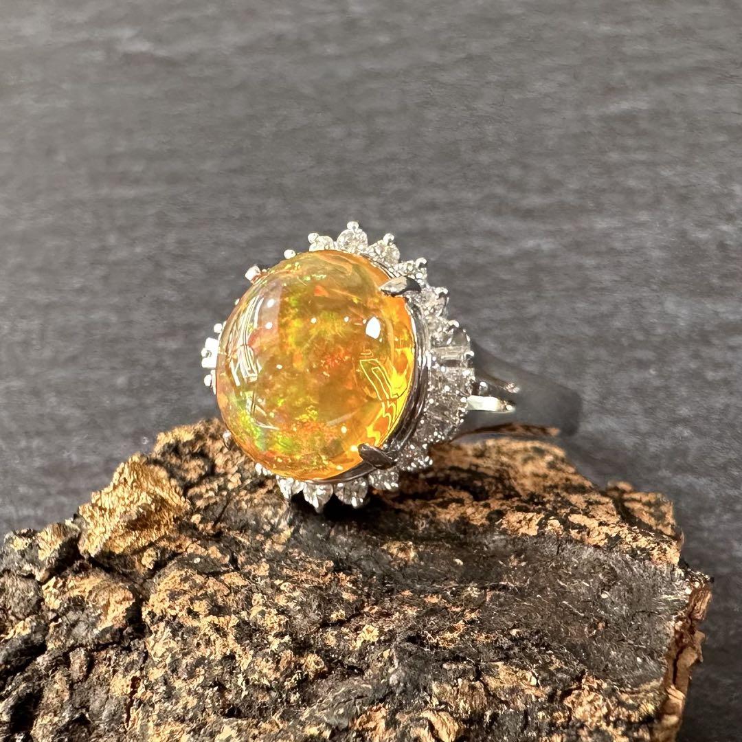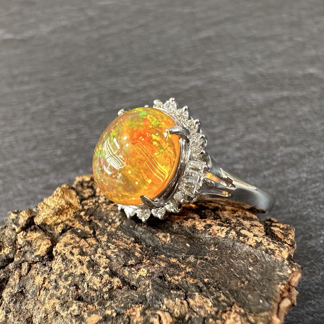 鮮やかなオレンジに遊色効果が美しく広がり、角度によってグリーンやイエローの輝きが楽しめます。周囲には上質なダイヤモンドがセッティングされ、豪華で存在感のあるデザインです。