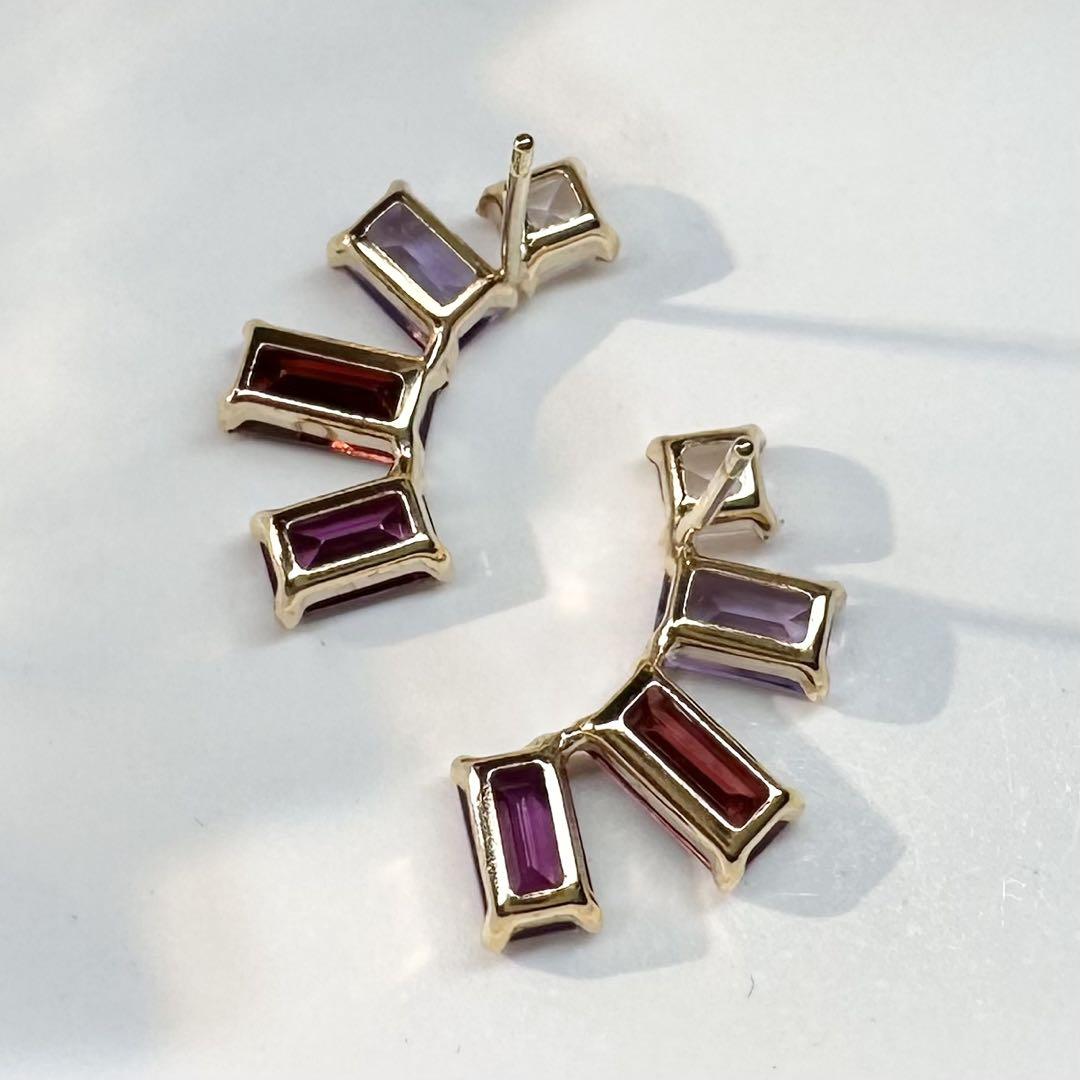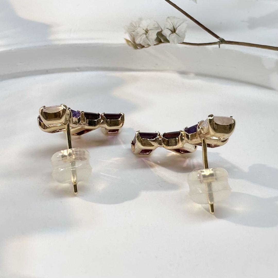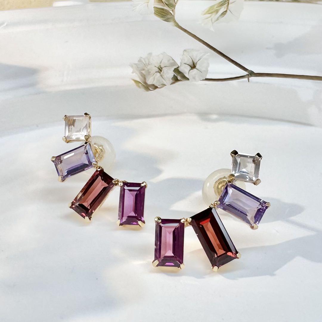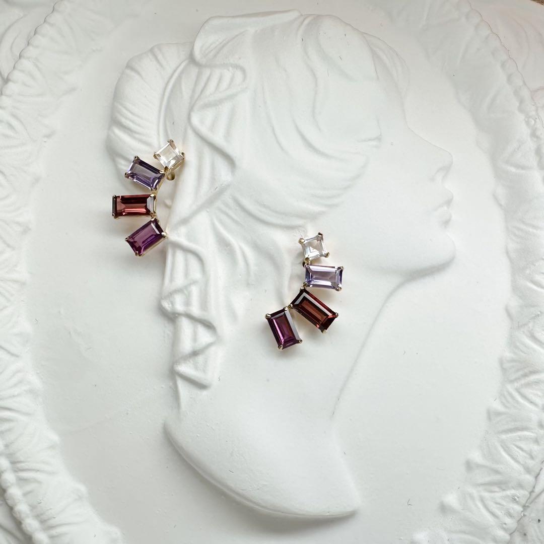 華やかで個性的な輝きを放つ、K18製のミックスストーンピアスです。スクエアカットの色鮮やかな天然石を贅沢にセッティングし、動くたびに光を反射して耳元を美しく彩ります。アメシストの深みのある紫、ガーネットの情熱的な赤、ローズクォーツの柔らかな透明感が調和し、上品かつ遊び心あるデザインに仕上がっています。シンプルな装いのアクセントとしても、華やかなシーンのコーディネートにもおすすめです。
