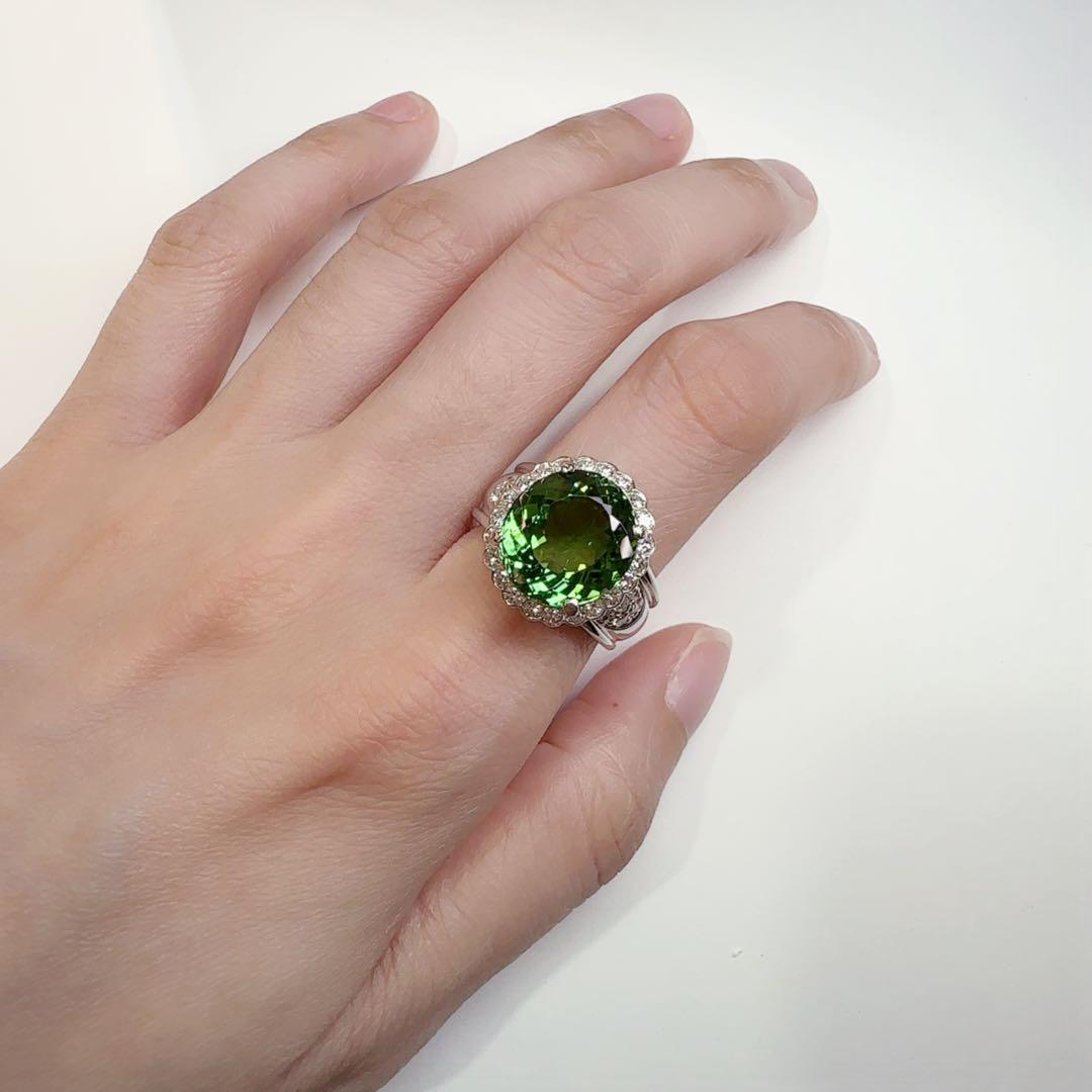 瑞々しいグリーンの輝きを放つ、大粒7.69ctの天然トルマリンリング。贅沢なサイズ感と圧倒的な存在感で、指先を一気に華やかに。取り巻きには繊細に配されたダイヤモンドが輝きを添え、上品さと華やかさを兼ね備えたデザインです。