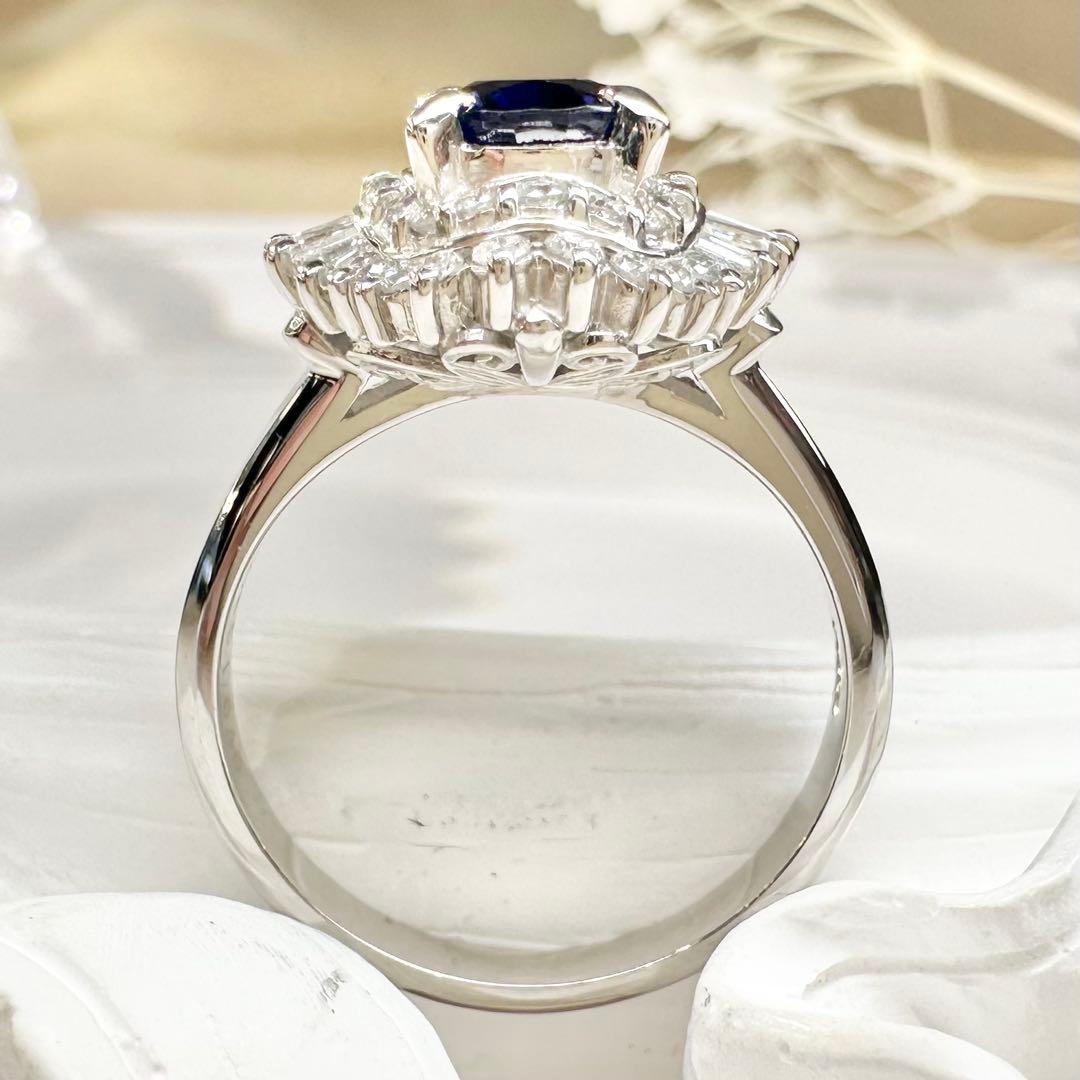PT900製、1.25ctの上質なサファイアをセンターに配した豪華な取り巻きリングです。深く濃いロイヤルブルーのサファイアは、光を受けると鮮やかな青の輝きを放ち、存在感は抜群。その周囲をラウンドダイヤモンドとバゲットカットダイヤモンドで贅沢に囲み、クラシカルで気品あるデザインに仕上げられています。重厚感のあるプラチナ枠が石の美しさをより一層引き立て、まさに王道ハイジュエリーの佇まい。