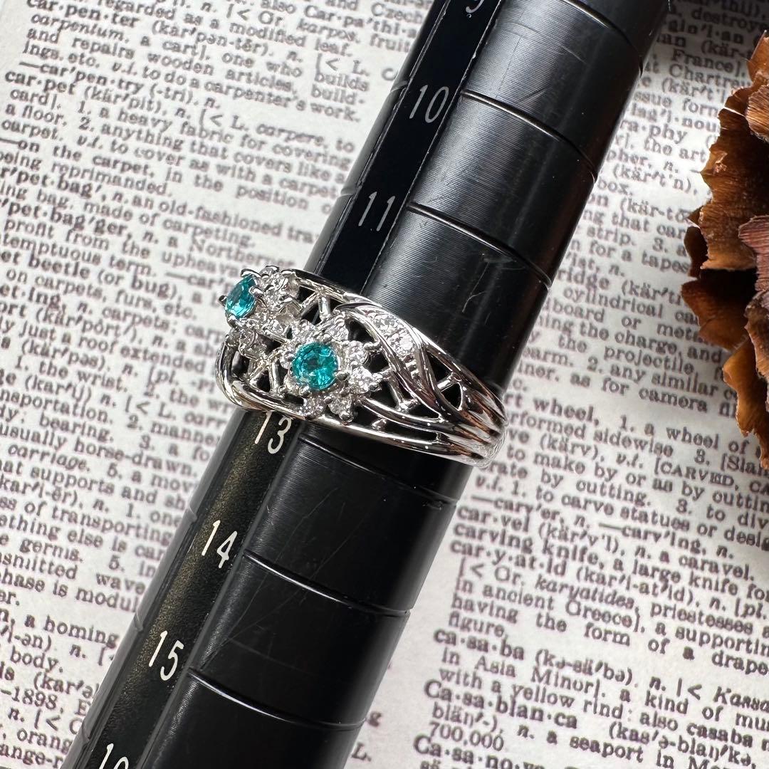 1980年代後期から1990年代初頭の様式を感じさせるヴィンテージリング。1970年代の華麗自然主義の流れを受け継ぎつつ、透かし細工による構築的なデザインへと発展した時代背景を映します。対称に配されたパライバトルマリンが幾何学的フレームの中で際立ち、PT900の重厚な仕立てが高級感を演出。装飾性と構造美が調和した一本です。