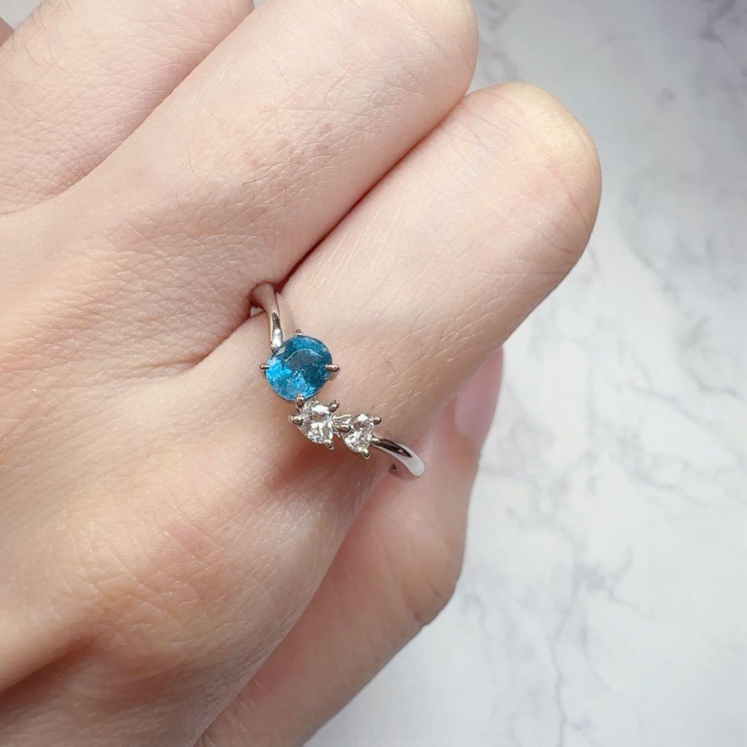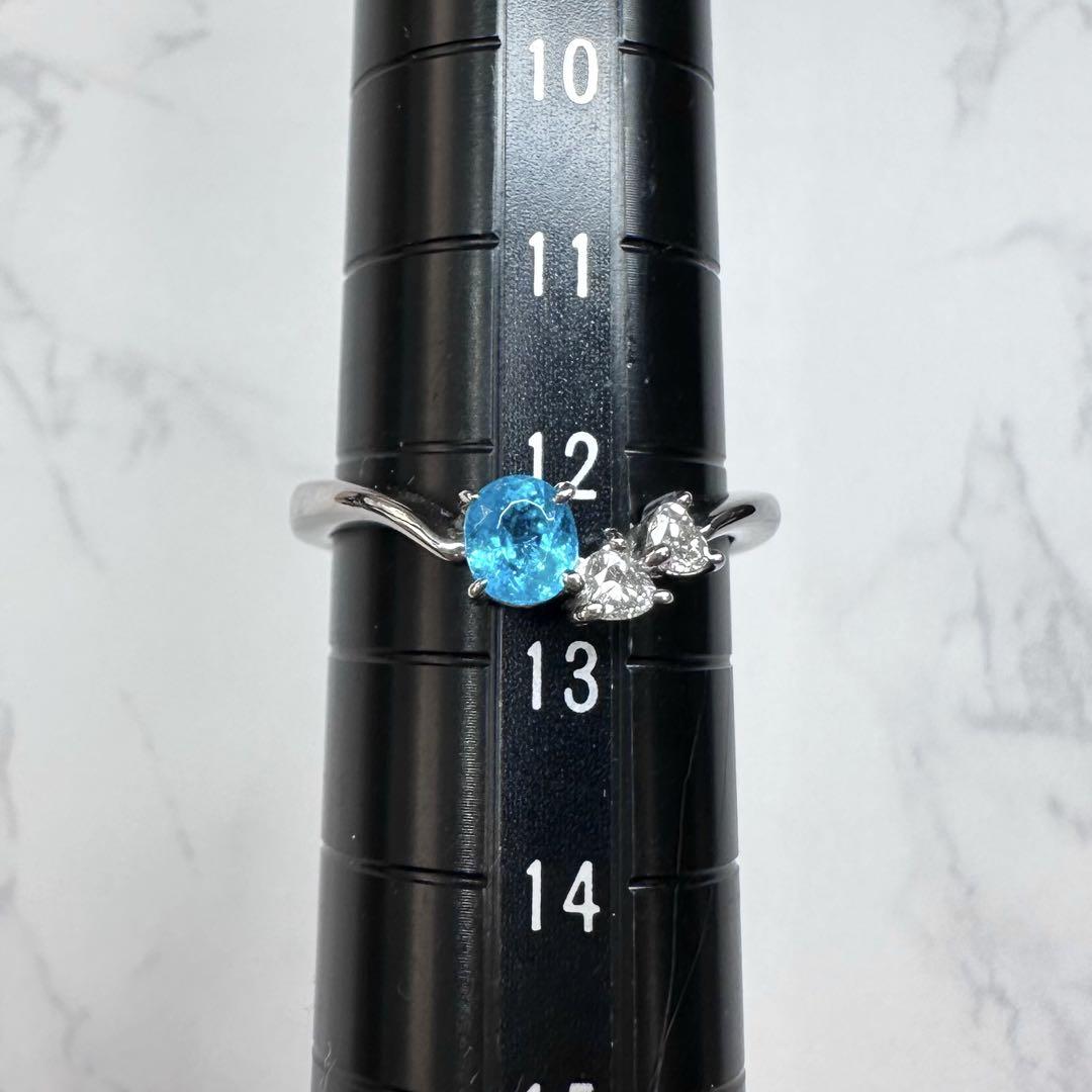 透明感と発色の良さが際立つパライバトルマリンに、トリリアントカットのダイヤモンドが寄り添い、可憐で上品なデザインとなっています。角度によって表情を変える輝きが、指元を一層華やかに彩ります。