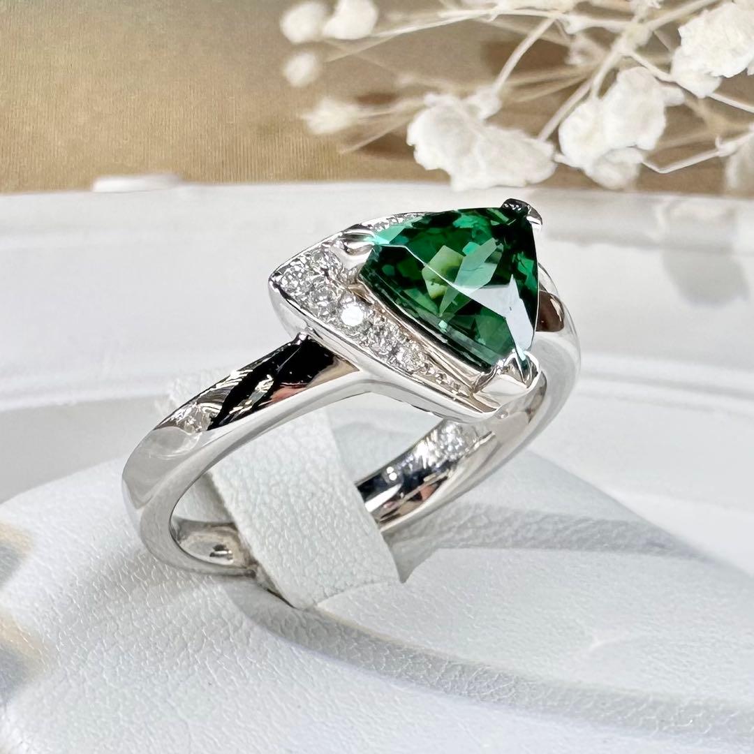 PT900プラチナ製、深みのあるグリーンブルーが魅力のラグーントルマリン1.29ctを主石にしたリングです。トライアングルカットが個性的で、周囲に施されたダイヤモンドが上品な輝きを添えます。存在感のあるデザインで、コレクションにもおすすめの一品です。中古品のため細かなスレはご了承ください。