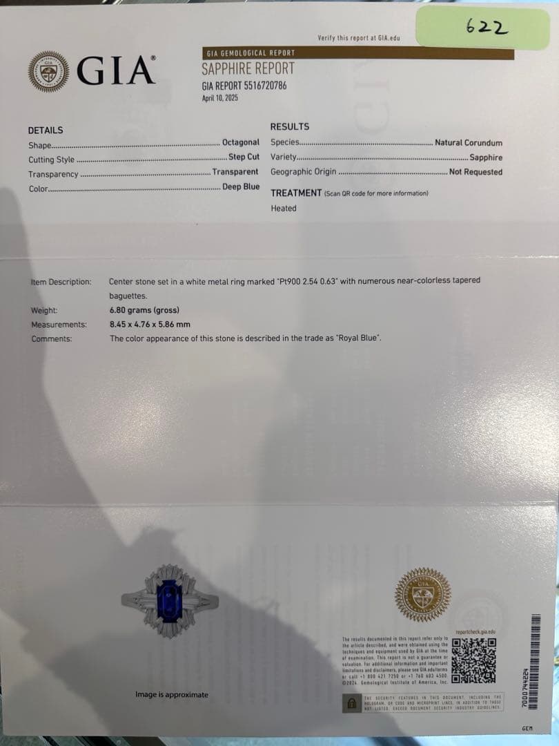PT900プラチナ製、GIA鑑別書付きロイヤルブルーサファイア2.54ctを主石にしたハイグレードリングです。濃く鮮やかなブルーが際立ち、周囲のバゲットダイヤモンドが華やかに輝きを添えます。資産性と気品を兼ね備えた逸品。中古品のため細かなスレはご了承ください。