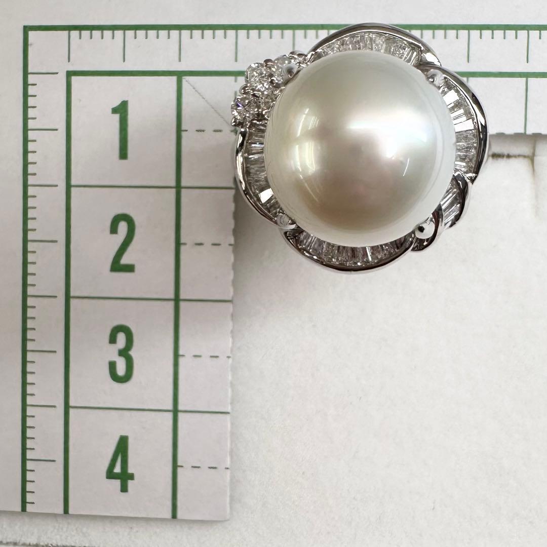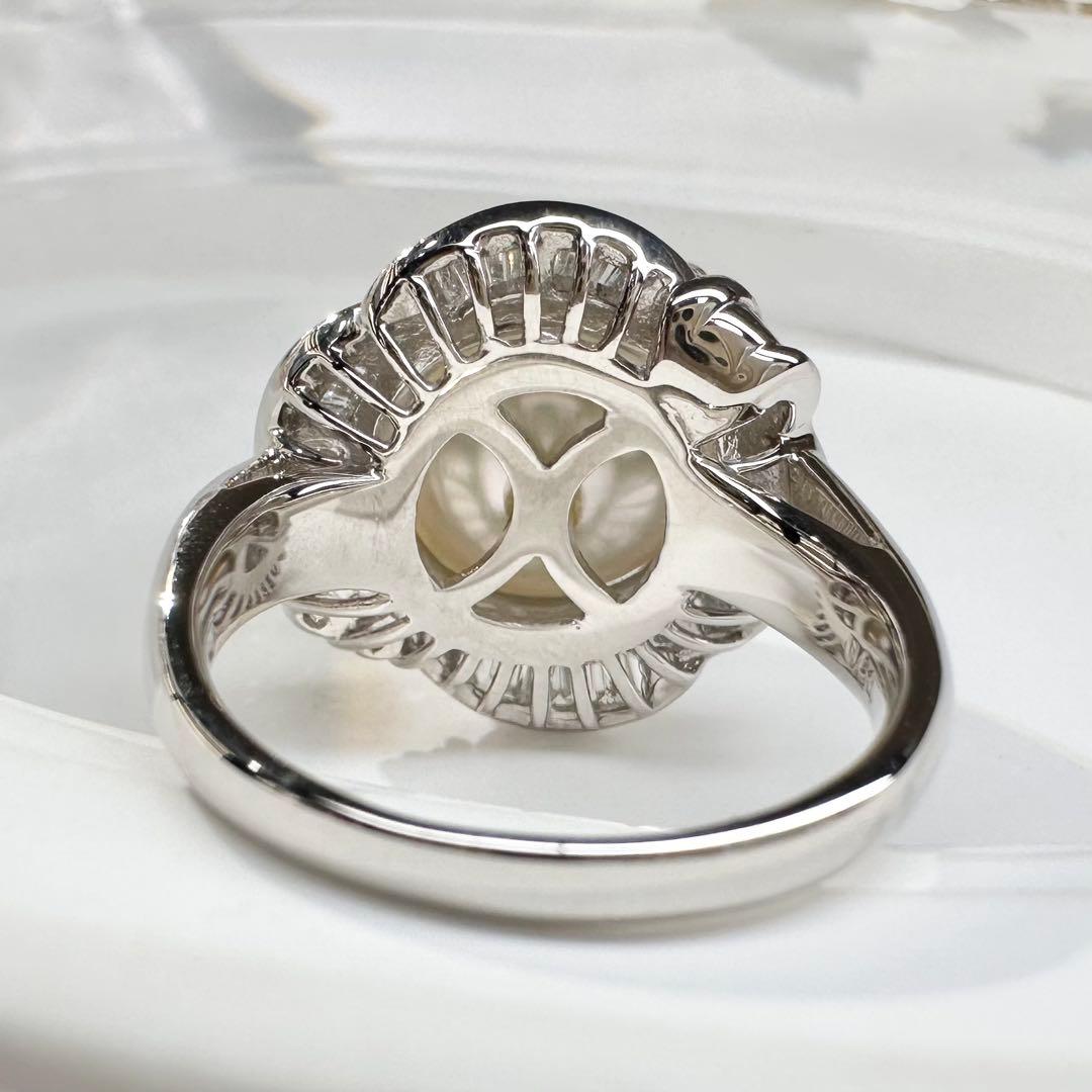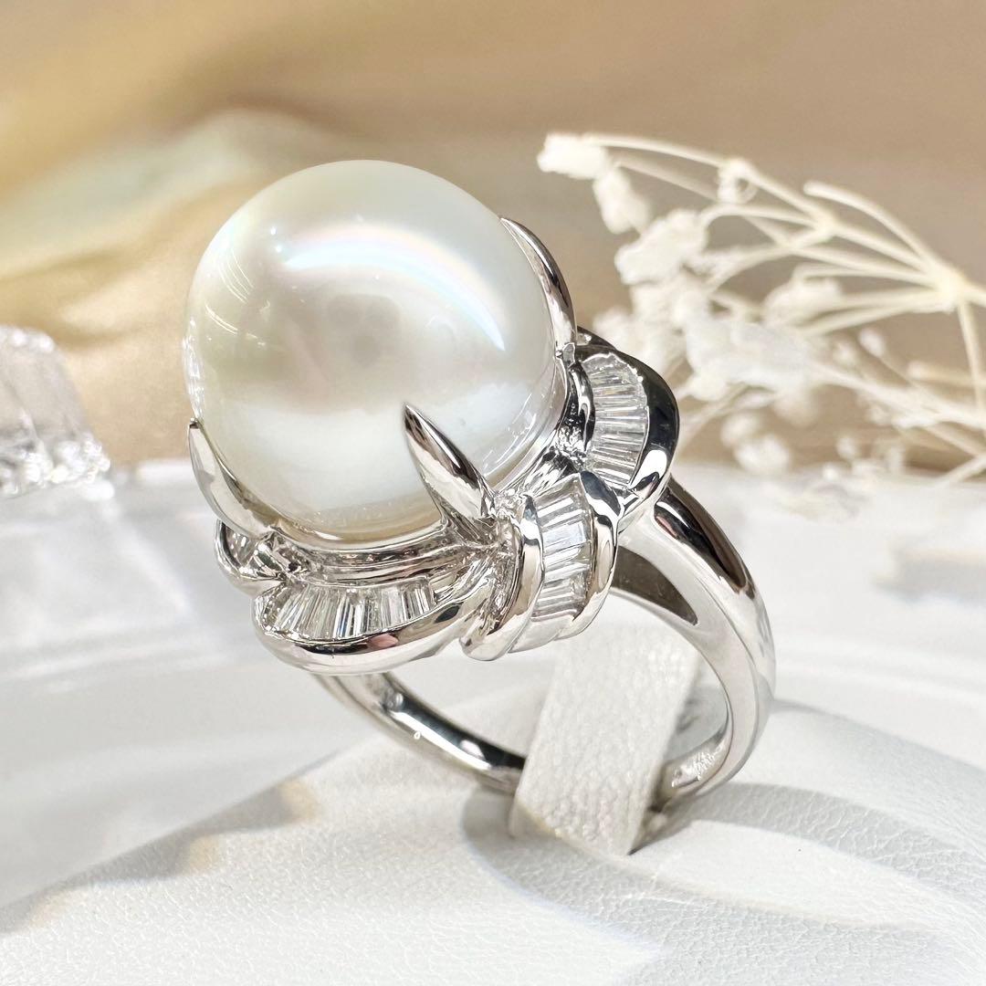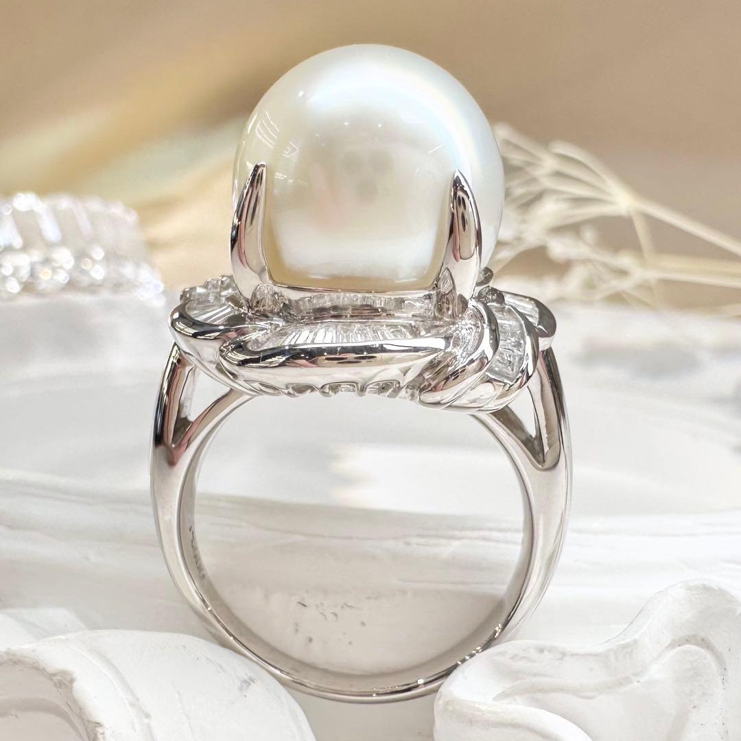 PT900プラチナ製、12.8mmの大粒・大渓地パールを贅沢にあしらった存在感抜群のリングです。なめらかで厚みのある真珠層、上品なホワイト系の光沢が美しく、優雅で気品ある印象を演出します。取り巻きにはバゲットカットダイヤモンドとラウンドダイヤモンドをセッティング。立体的なデザインがパールの美しさをより一層引き立て、高級感あふれる仕上がりです。