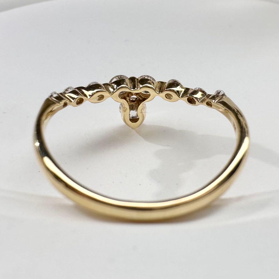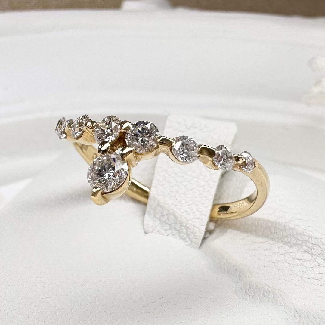 K18にダイヤモンドを贅沢に配置した華やかなリングです。センターの一粒が下がるように輝き、指元をスッと長く見せてくれる上品なデザイン。合計0.5ctならではの存在感がありつつ、普段使いにも馴染むバランスの良さが魅力です。光を受けるたびキラキラと反射し、手元の仕草をより美しく演出。重ね付けも相性。大切な記念日や自分へのご褒美ジュエリーにおすすめです。