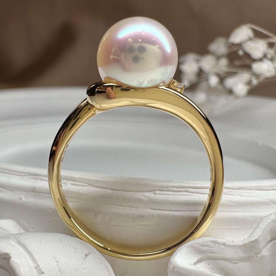 上品な輝きを放つ K18 アコヤ真珠リング です。約0.9mmの大粒アコヤパールは、ほんのりとしたピンクがかった艶やかな光沢を持ち、手元を美しく引き立てます。横には小さなダイヤモンドがセッティングされ、シンプルながらも華やかさをプラス。普段使いから特別なシーンまで幅広くお使いいただける、上品でエレガントなデザインです。プレゼントにもおすすめの逸品です。