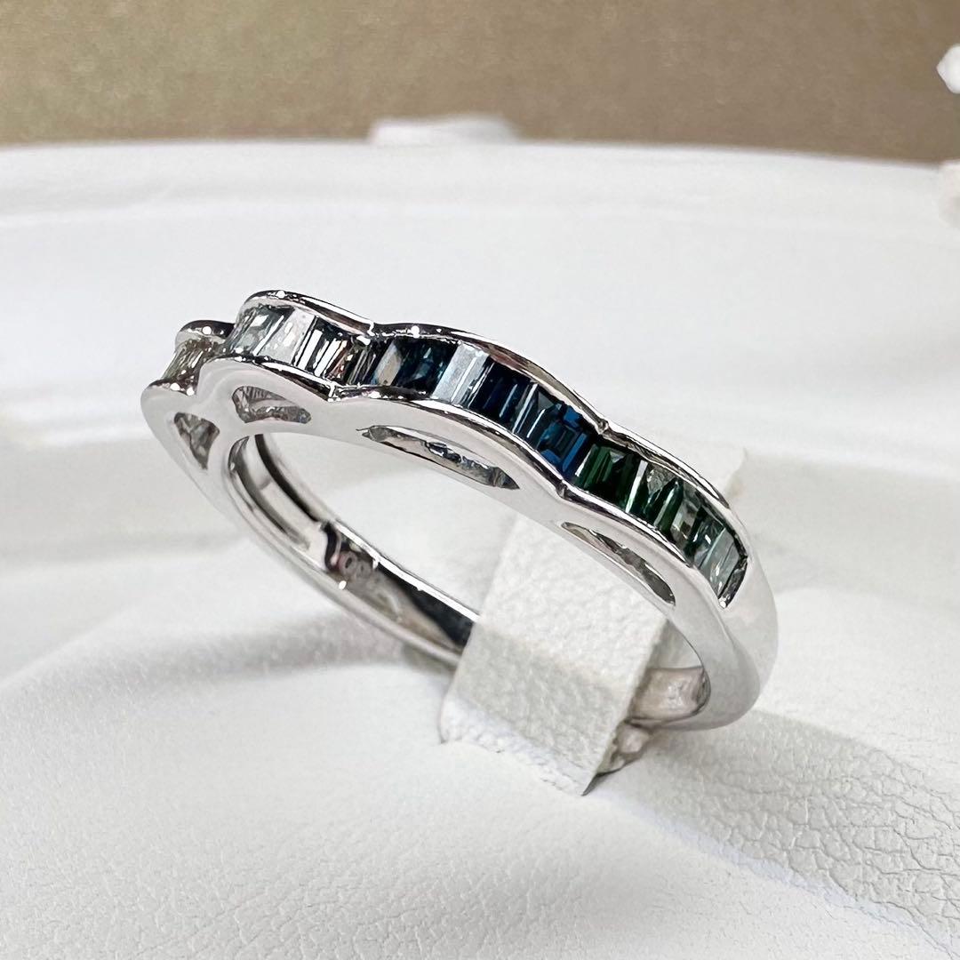 K18にカラーダイヤモンドを贅沢にセッティングした、グラデーションデザインのリングです。淡いミント、スカイブルー、ディープブルーへと移り変わるバケットカットの煌めきが、指先に洗練された輝きを添えます。透き通るような色彩バランスで、シンプルながら存在感のある一本。重ね付けにも相性が良く、普段使いからお出かけまで幅広く活躍します。希少なカラーグラデが好きな方におすすめの逸品です。