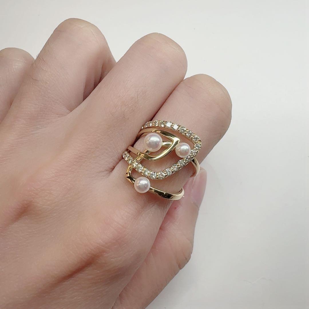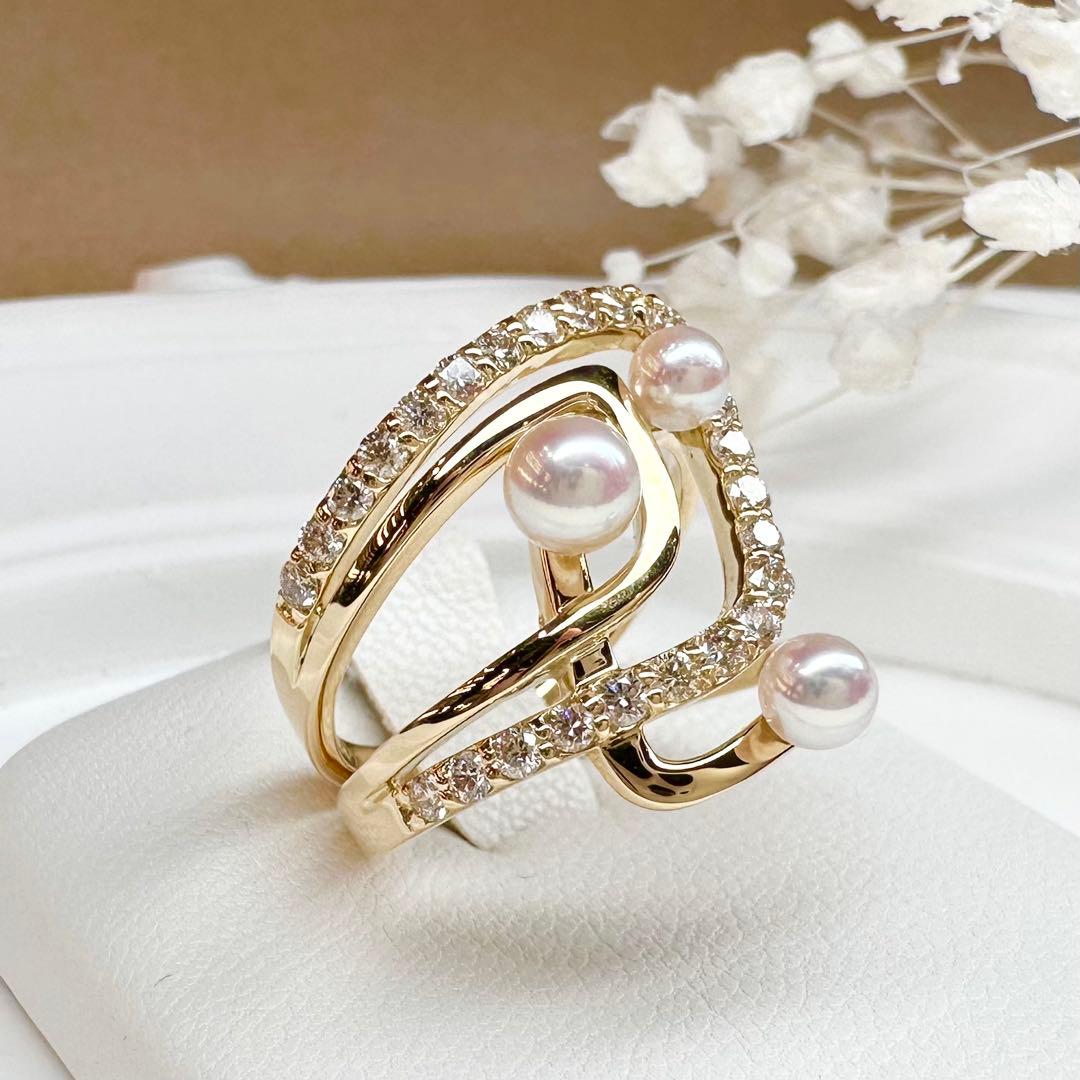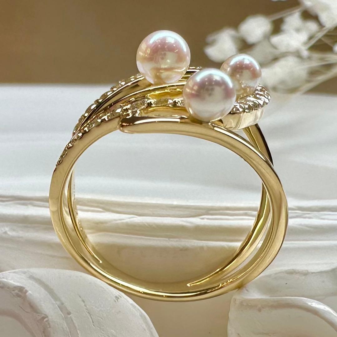 K18イエローゴールドを使用した、パールとダイヤモンドの豪華なリングです。美しいホワイトパール(3.4~4.3mm)が3珠配置され、繊細なダイヤモンドが煌めきを添えています。立体感あるデザインで、指元を華やかに彩ります。普段使いから特別なシーンまで幅広く活躍でき、フォーマルな装いにもぴったり。上質感がありながら可愛らしさも感じられるデザインです。