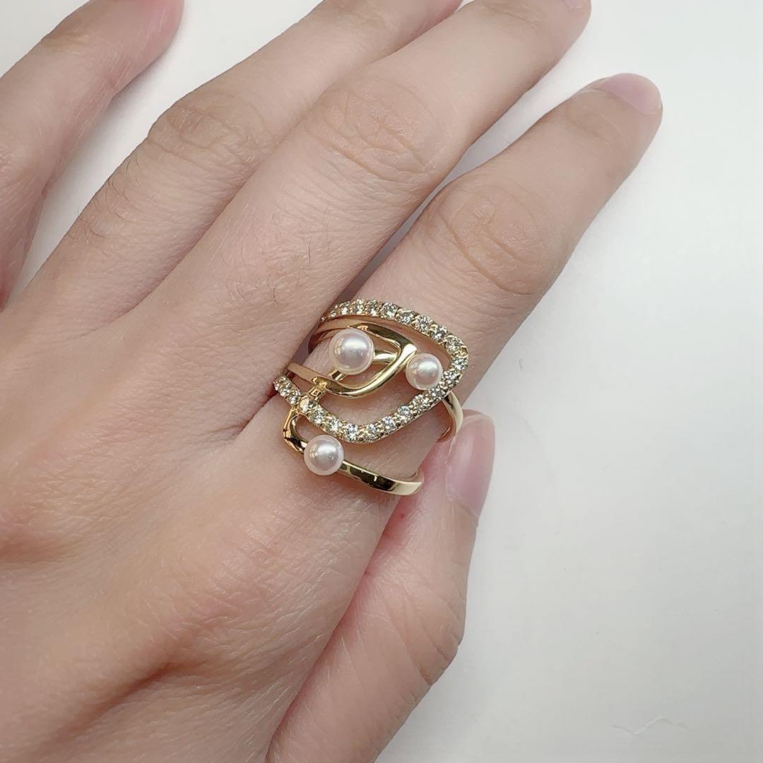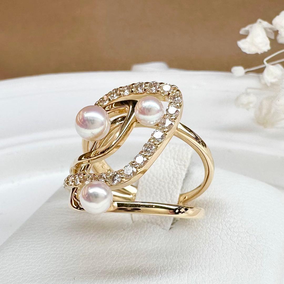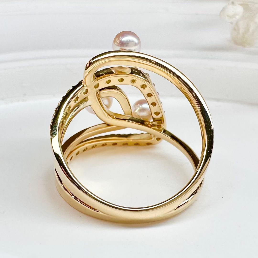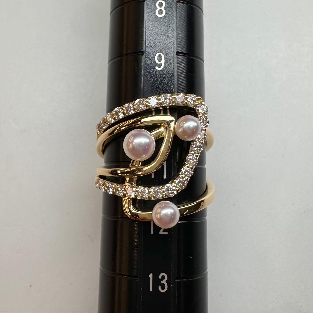 K18イエローゴールドを使用した、パールとダイヤモンドの豪華なリングです。美しいホワイトパール(3.4~4.3mm)が3珠配置され、繊細なダイヤモンドが煌めきを添えています。立体感あるデザインで、指元を華やかに彩ります。普段使いから特別なシーンまで幅広く活躍でき、フォーマルな装いにもぴったり。上質感がありながら可愛らしさも感じられるデザインです。
