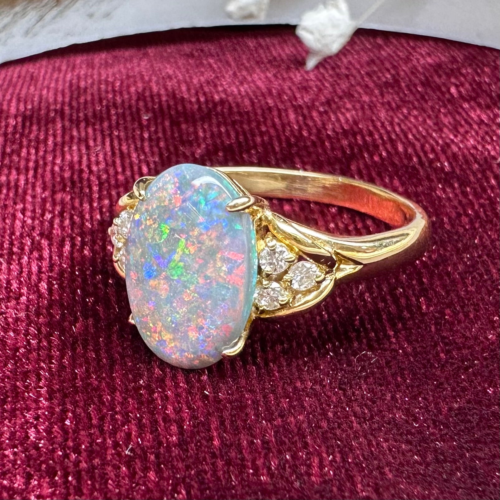 1990年代頃のクラシカルジュエリーデザインを感じさせるブラックオパールリング。中央には2.00ctの大粒ブラックオパールをセッティングし、鮮やかな遊色効果が指元を華やかに彩ります。サイドにはダイヤモンドをあしらい、当時流行した流れるような曲線フォルムが優雅な印象。ボリューム感のある作りと華やかな輝きが魅力の、ヴィンテージ感あふれる一品です。