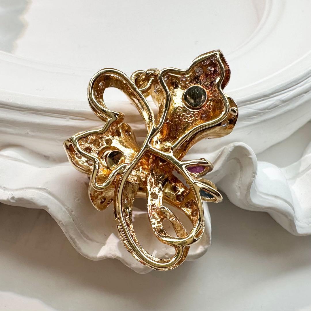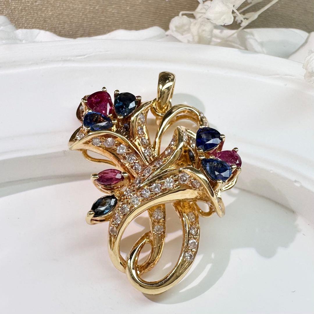 K18(18金)イエローゴールドを使用した、華やかなミックスコランダムのペンダントトップです。サファイア・ルビー系を含むマルチカラーのコランダムがバランス良くセッティングされ、動きのある立体的なデザインが胸元を美しく彩ります。コランダムはルビー・サファイアを含む宝石グループで、耐久性が高く日常使いにも適した天然石です。ダイヤモンドもあしらわれ、上品な輝きと高級感を兼ね備えた一点物ジュエリーとなっております。