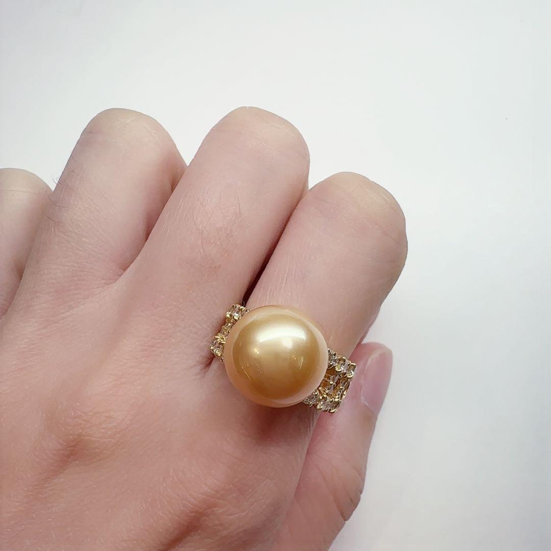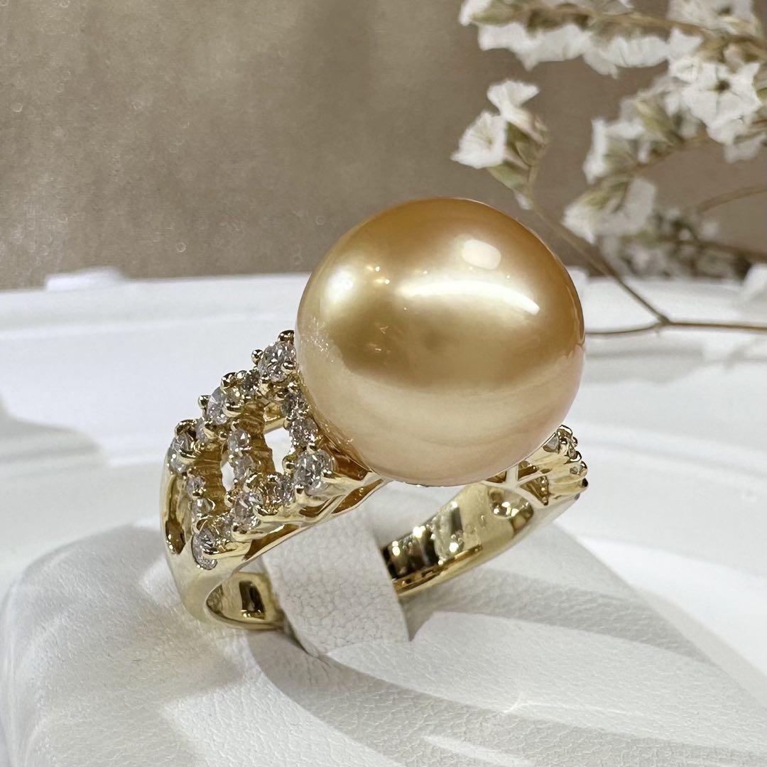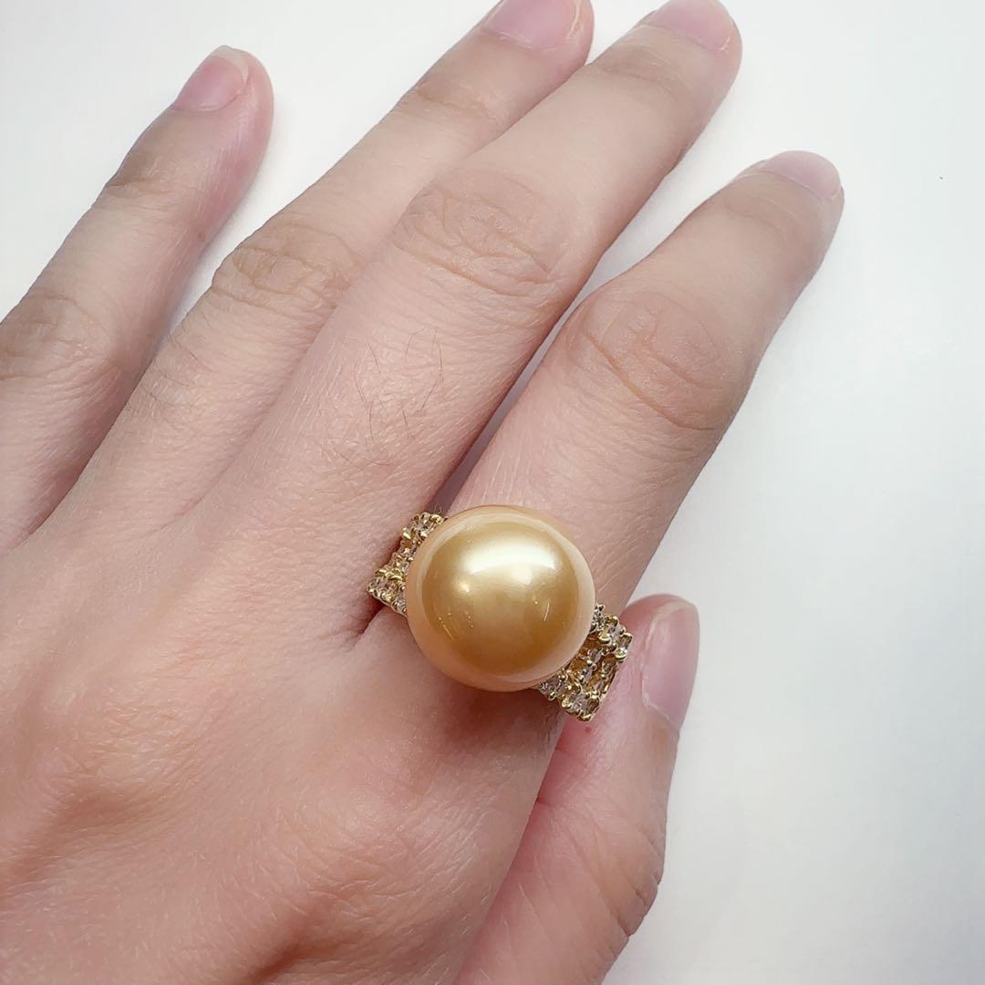 高級感あふれる K18イエローゴールド製 南洋パールリング です。12.3mmという大粒の南洋パールは存在感抜群で、深みのあるゴールデンカラーが手元を華やかに演出してくれます。さらにアーム部分にはダイヤモンドが贅沢にあしらわれており、上品な輝きとパールの艶めきが見事に調和しています。特別な日の装いにはもちろん、フォーマルや華やかなパーティーシーンにも最適です。