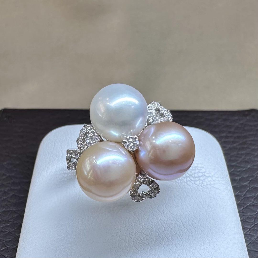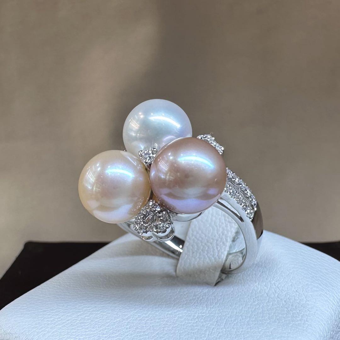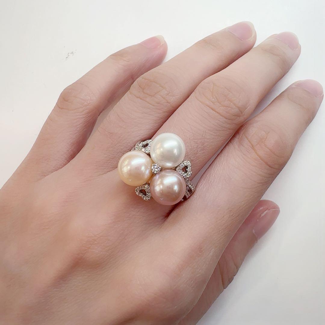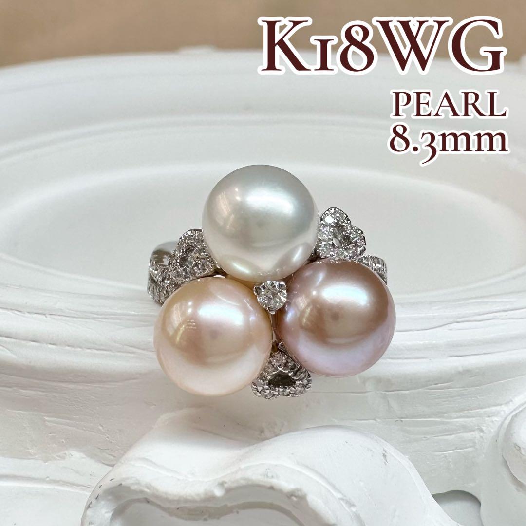 【K18WG】真珠 パール 8.3mm ダイヤモンドリング 上品デザイン 3粒