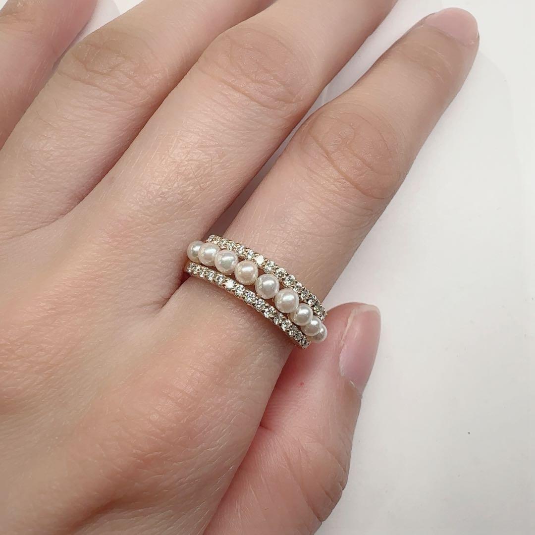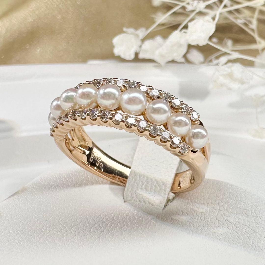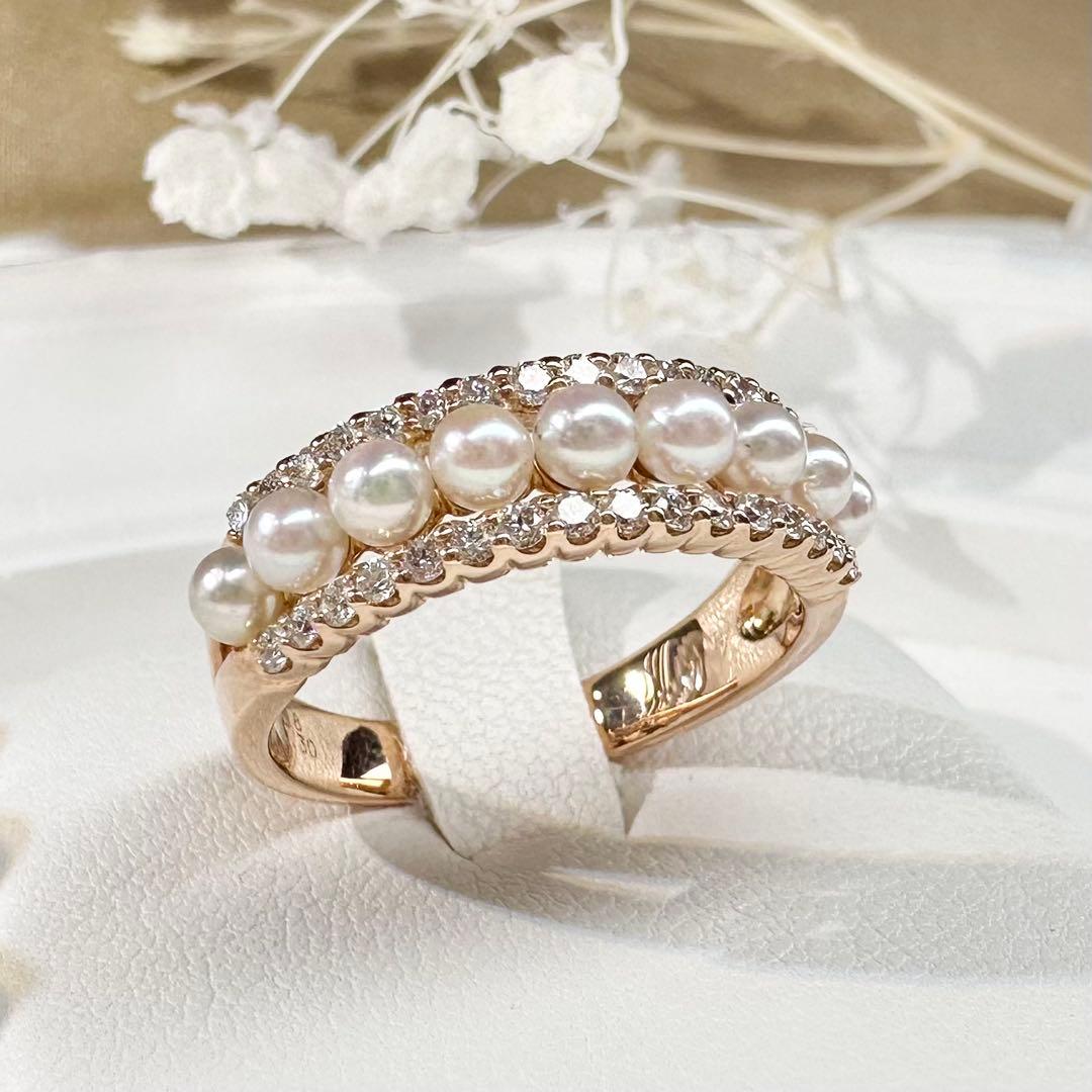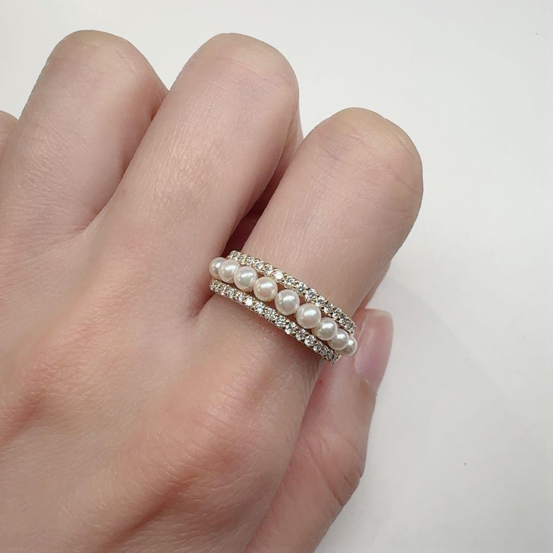 Ponte VecchioのK18製リングです。上質なアコヤ真珠を連ね、上下にダイヤモンドを配した華やかなデザイン。パールの優しい艶と繊細な輝きが重なり、上品で女性らしい印象に。重ね着け風の立体的なフォルムも魅力です。中古品のため細かなスレはご了承ください。
