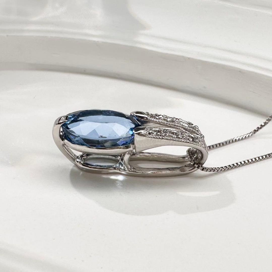 透明感あふれる大粒アクアマリンが美しいペンダントネックレスです。2.64ctの存在感あるオーバルカット。澄み切った海のようなブルーカラーが胸元を上品に彩ります。バチカン部分にはダイヤモンドをセッティング。繊細なミル打ち風のデザインがクラシカルな高級感を演出します。石のボリュームと輝きのバランスが良く、フォーマルからデイリーまで幅広くお使いいただける一本です。