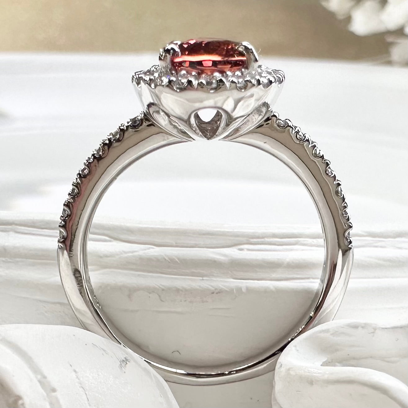 希少性の高いパパラチアサファイア1.37ctを主石に使用したPT900リングです。オレンジとピンクが溶け合うような独特の色彩は、パパラチアならではの魅力。周囲にはダイヤモンドを贅沢に配し、主石の華やかさを一層引き立てています。気品と存在感を兼ね備えたデザインで、特別なコレクションや記念の一本としてもおすすめの上質ジュエリーです。