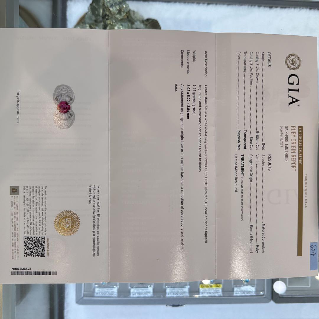 【美品】Pt900 ミャンマー産 ルビー 1.05ct ダイヤリングGIA付