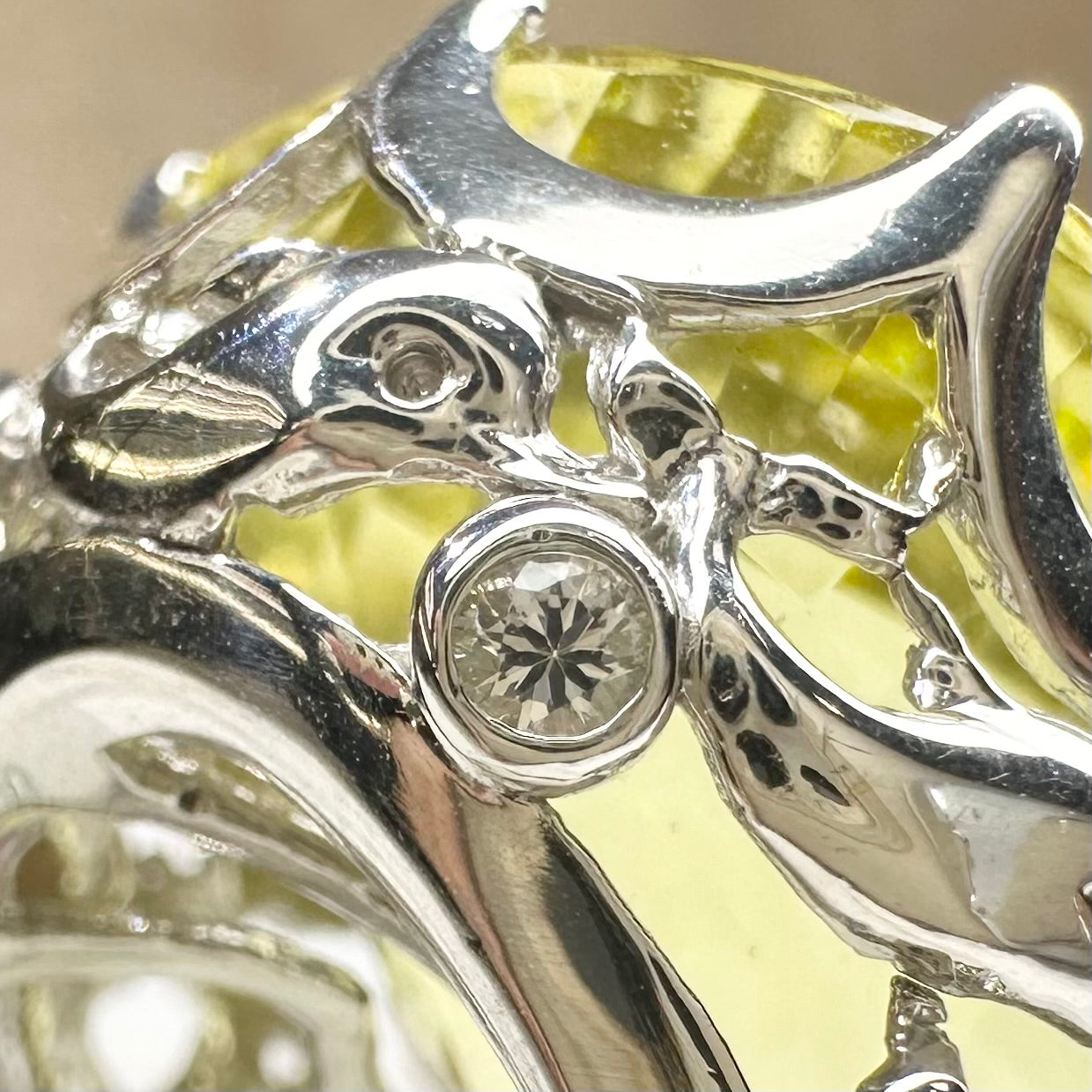 K18枠にセッティングされたクォーツリングです。55.33ctという圧倒的なサイズを誇る主石は、透明感のあるイエローグリーンカラーが美しく、光を受けるたびに力強い輝きを放ちます。大粒ならではのボリューム感と、洗練されたカットが指元に圧倒的な存在感を演出。舞台用やコレクションジュエリーとしてもおすすめの一点です。