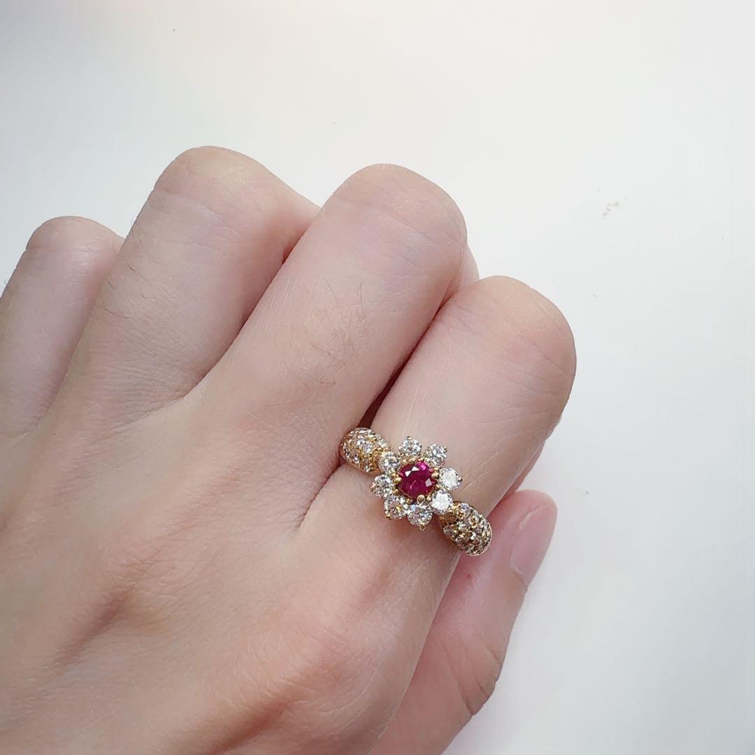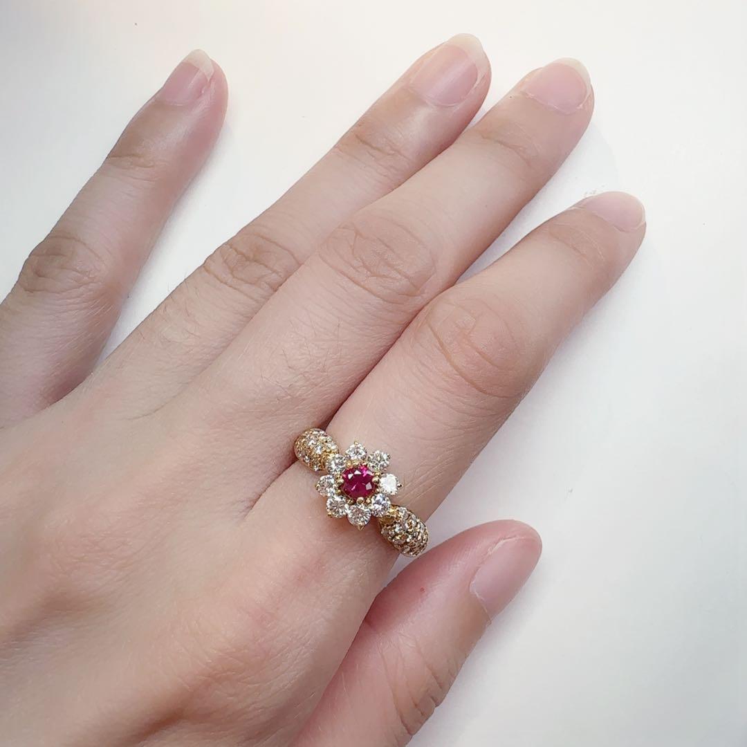 華やかなフラワーデザインが印象的なK18ルビーリングです。中央には鮮やかなルビー(0.26ct)がセットされ、その周囲を輝きの良いダイヤモンドが取り囲んでおり、花のような上品なデザインに仕上がっています。アーム部分にもメレダイヤがあしらわれ、指元をより一層豪華に演出します。
