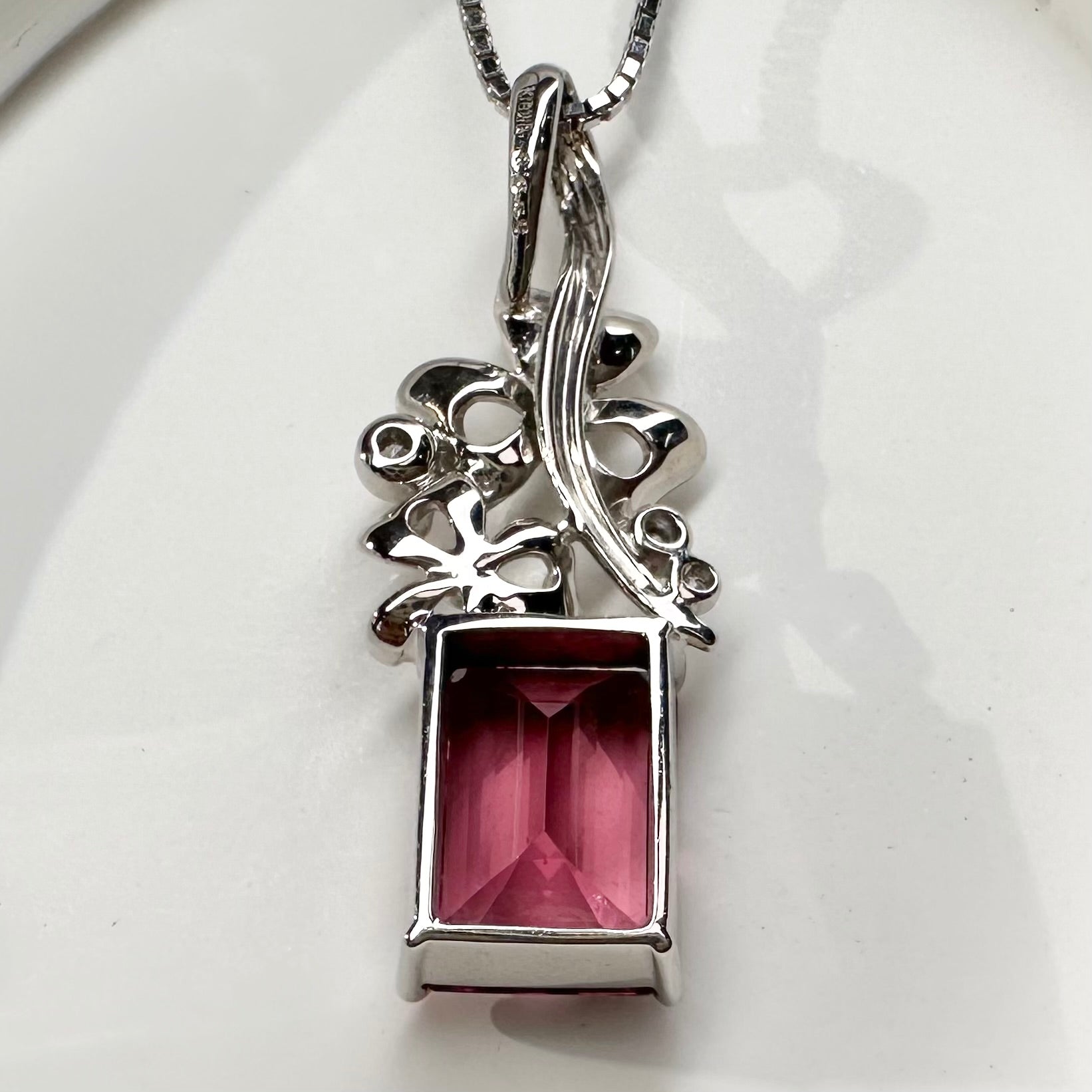 K18ゴールドに5.86ctのルベライトを主石に据えた存在感のあるネックレスです。深みのあるピンクレッドカラーが美しく、バゲットカットならではの直線的な輝きが石の透明感と色味を際立たせます。トップ部分にはダイヤモンドをあしらい、流れるようなデザインが上品な印象を演出。一点で主役になる、大人のための上質なカラーストーンジュエリーです。