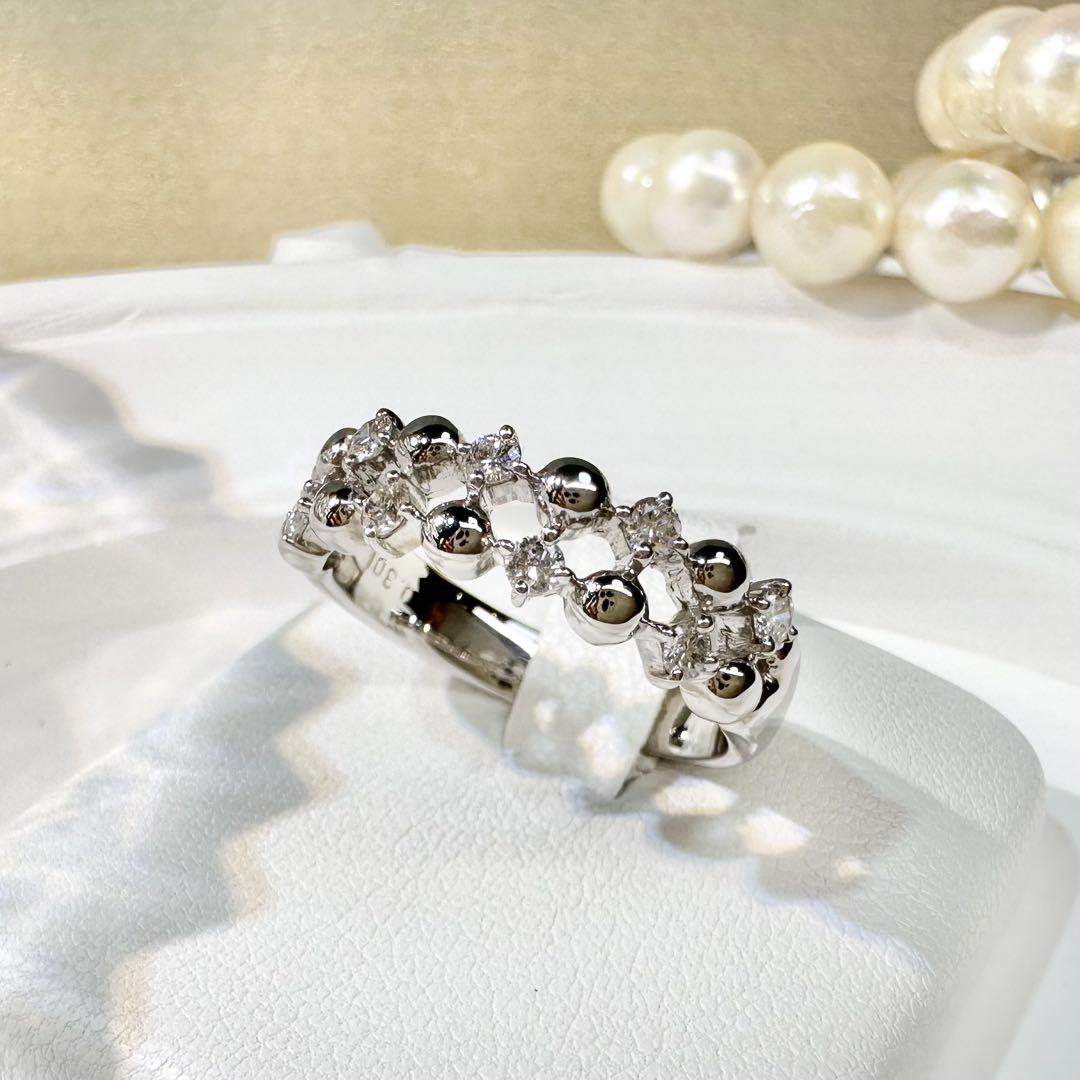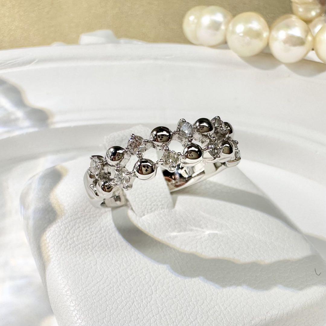 プラチナとダイヤの輝きが織りなす上品なデザインリング。球体の立体モチーフとダイヤの繊細な煌めきが、指元にモダンで洗練された印象を与えてくれます。