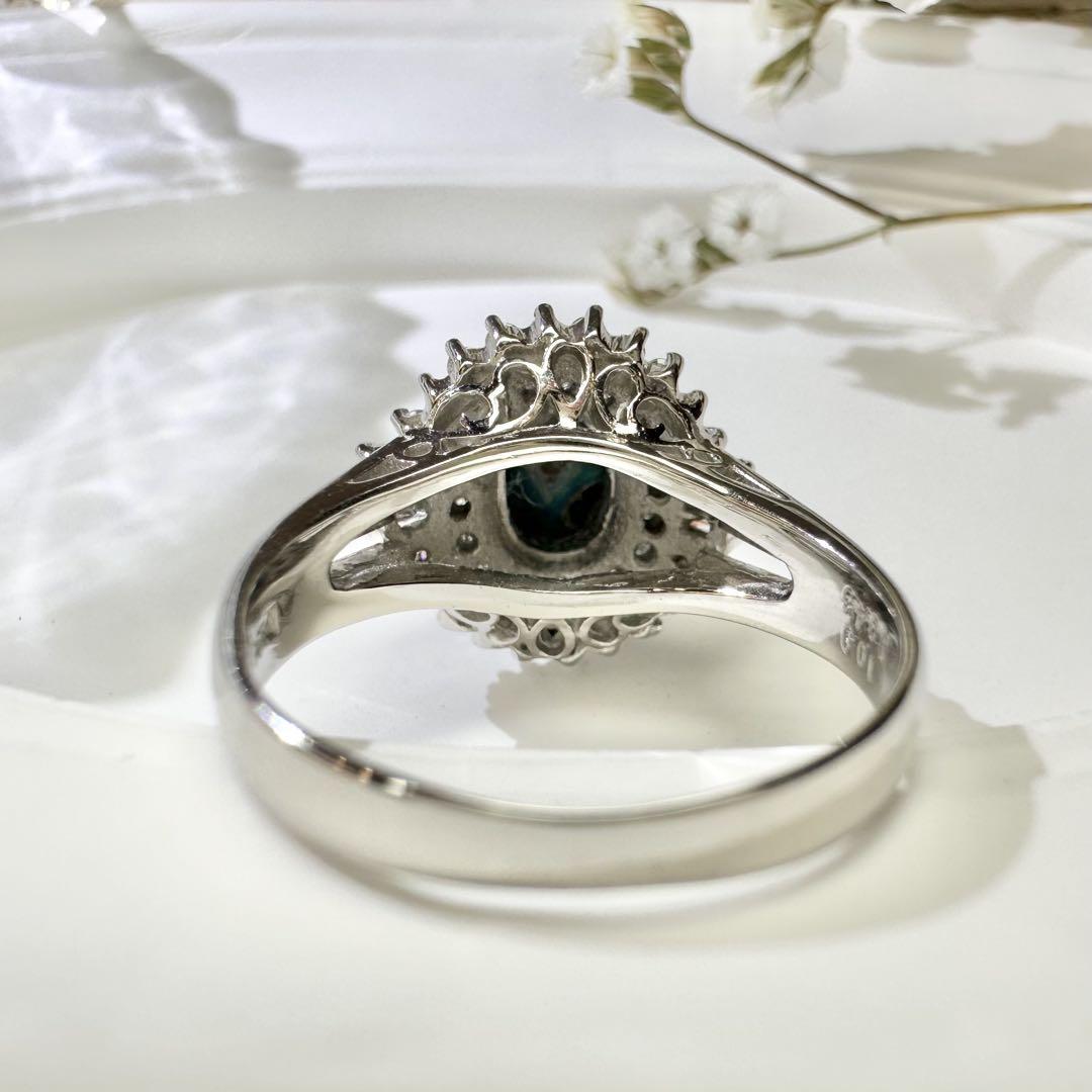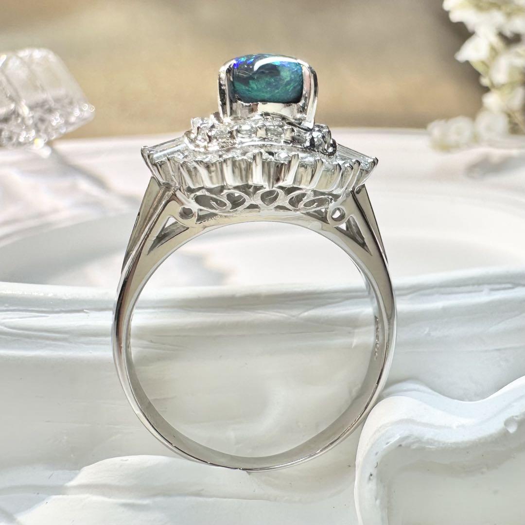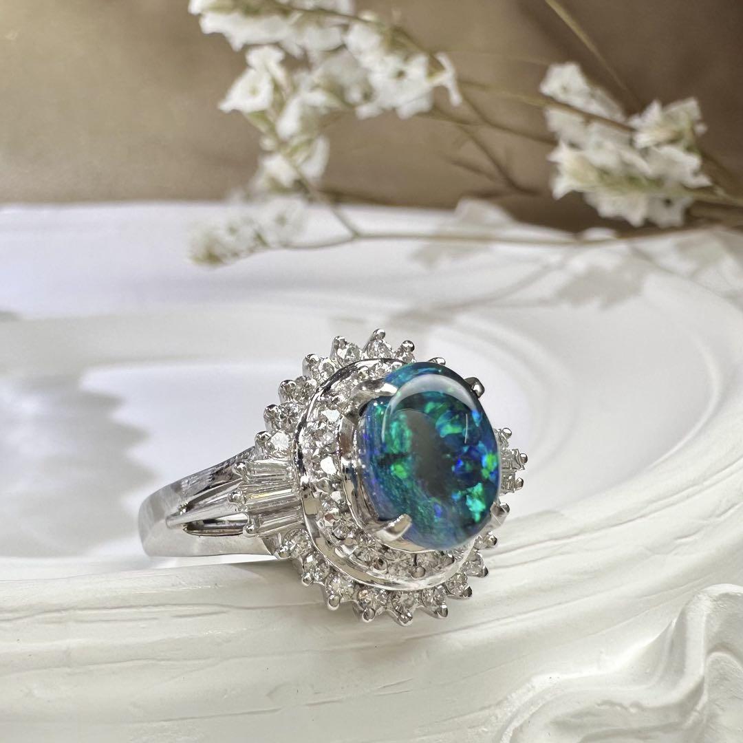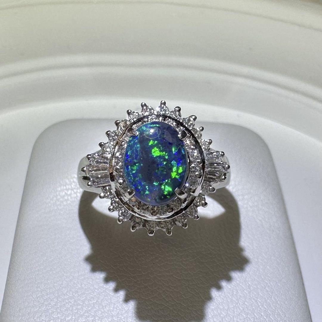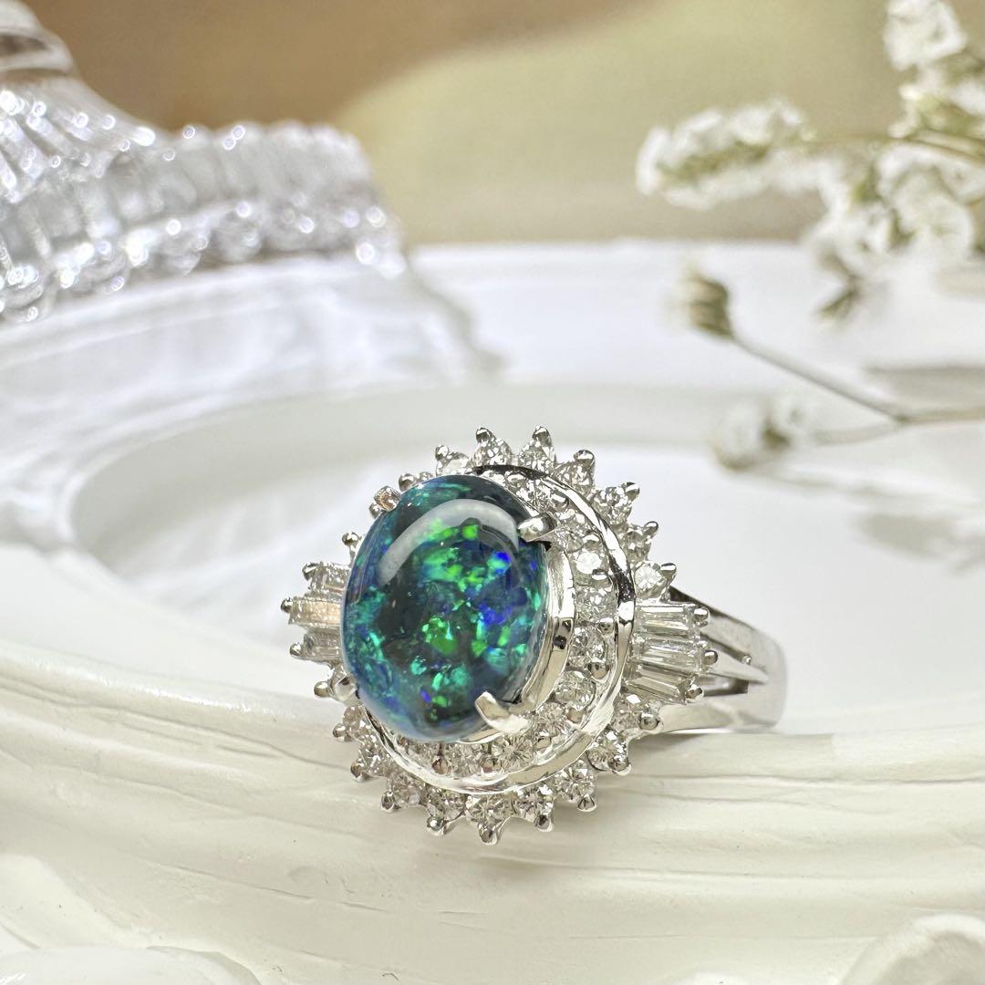 1.09ctのブラックオパールを使用した、高級感あふれるPT900リングです。ブルーやグリーンの遊色効果が美しく、まるで宇宙のように神秘的な印象を与える天然ブラックオパール。周囲を贅沢に囲むダイヤモンドが、中心の宝石をさらに引き立てています。ボリューム感のあるデザインで、特別なシーンにもぴったりです。