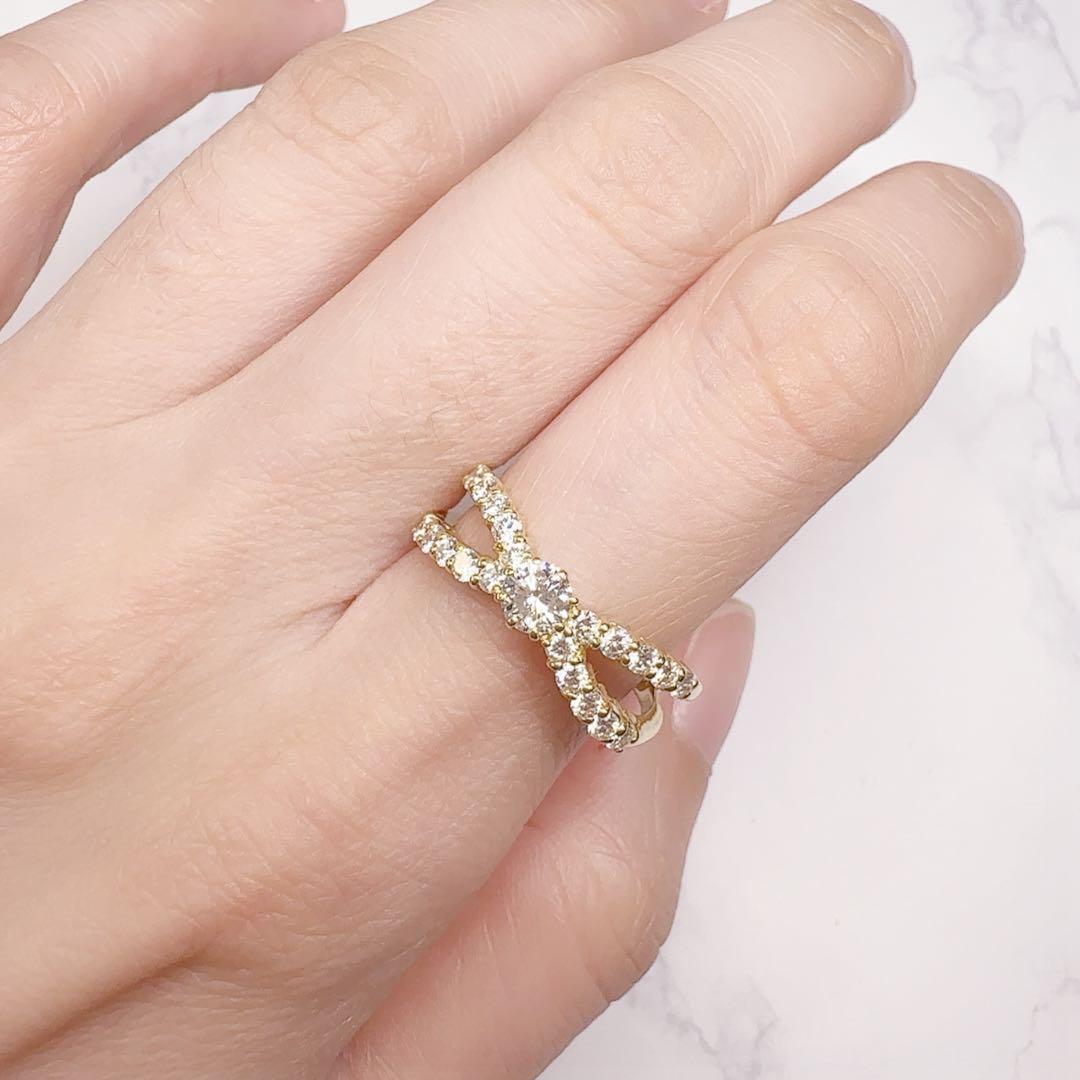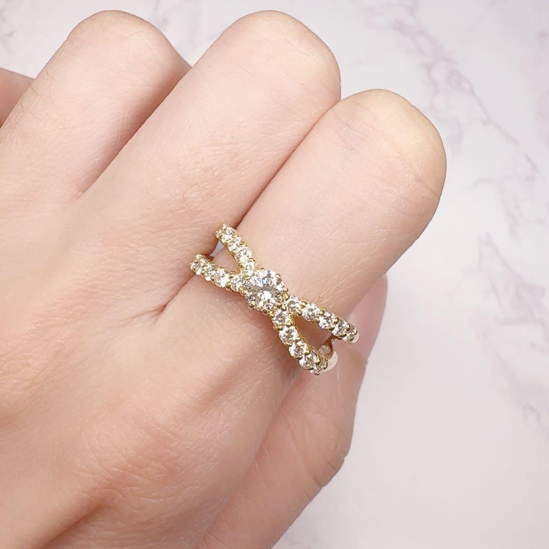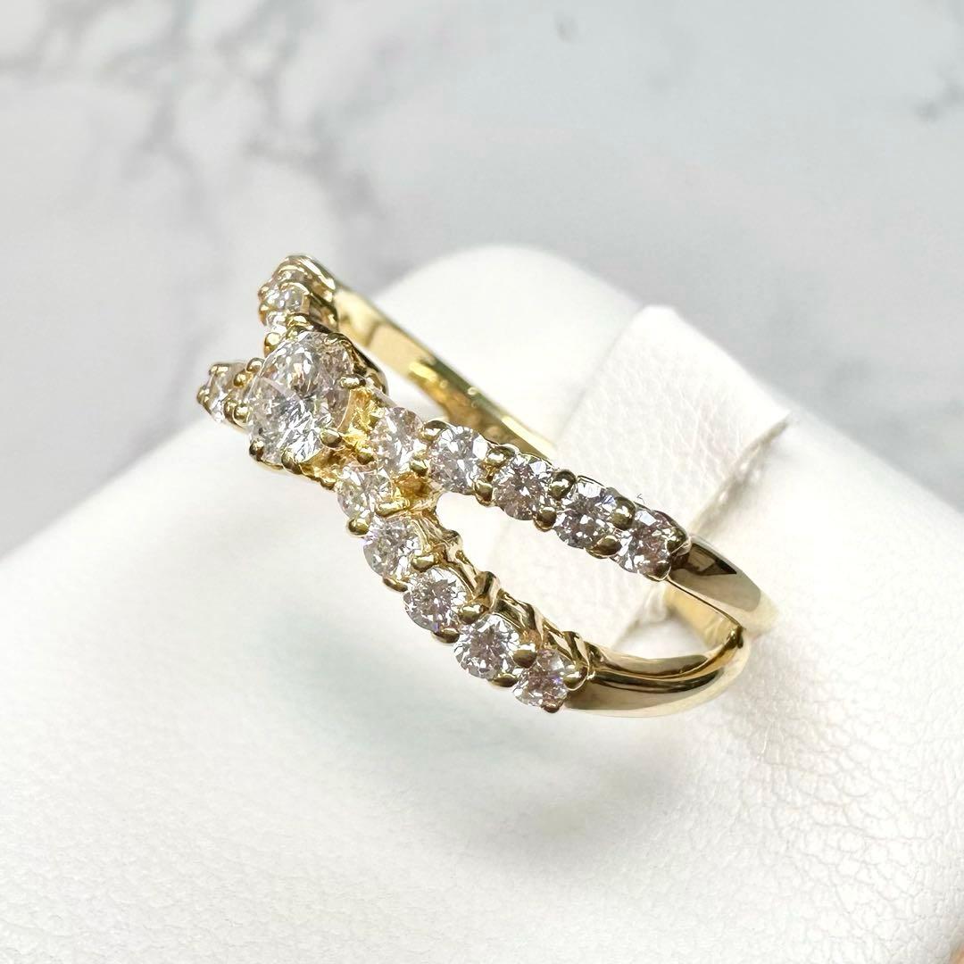 繊細に輝くダイヤモンドを贅沢にセッティングした、エレガントなK18ゴールドリング。クロスするダブルラインのデザインが、指元に立体感と華やかさを添え、8爪留めで中央の一粒ダイヤが気品ある存在感を放ちます。