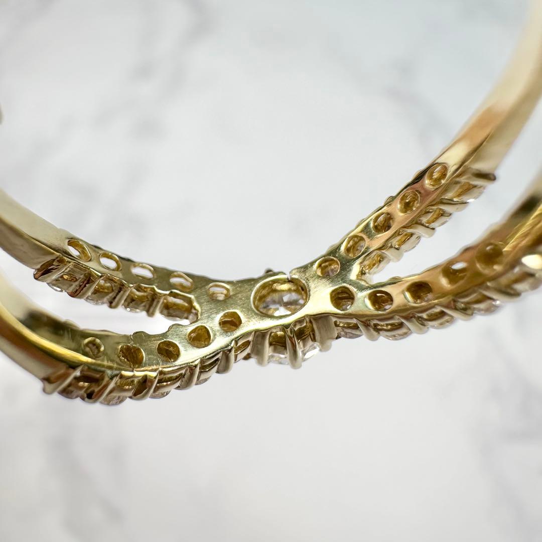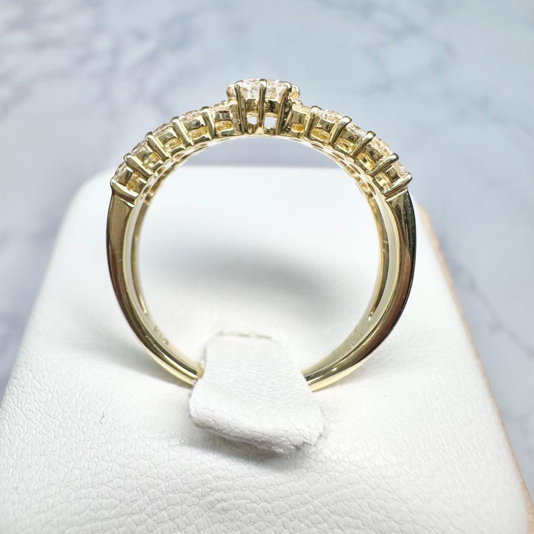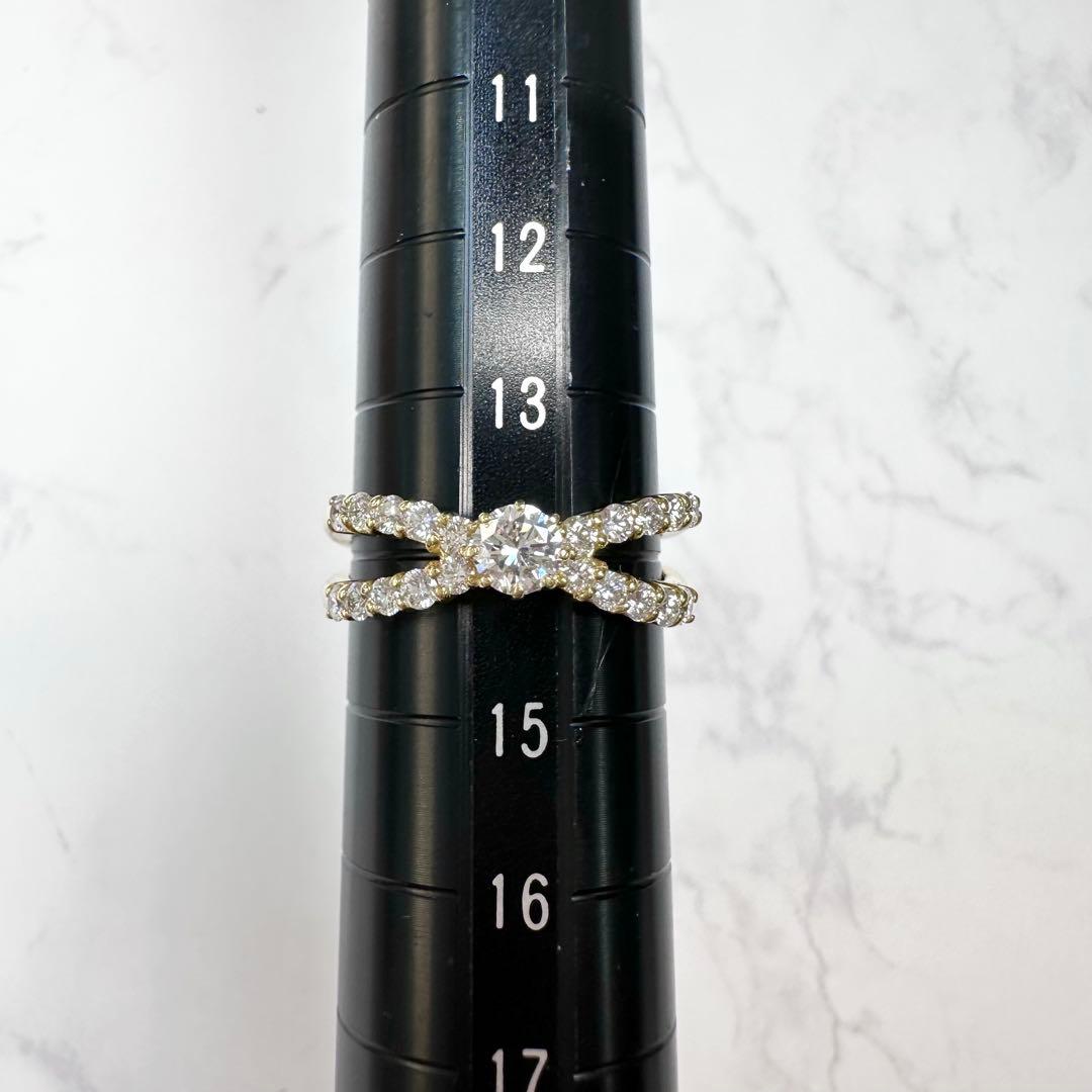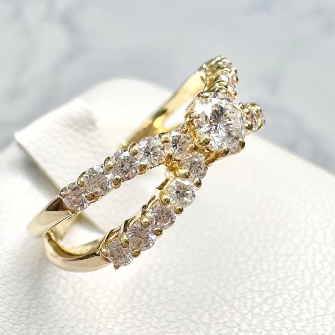 繊細に輝くダイヤモンドを贅沢にセッティングした、エレガントなK18ゴールドリング。クロスするダブルラインのデザインが、指元に立体感と華やかさを添え、8爪留めで中央の一粒ダイヤが気品ある存在感を放ちます。