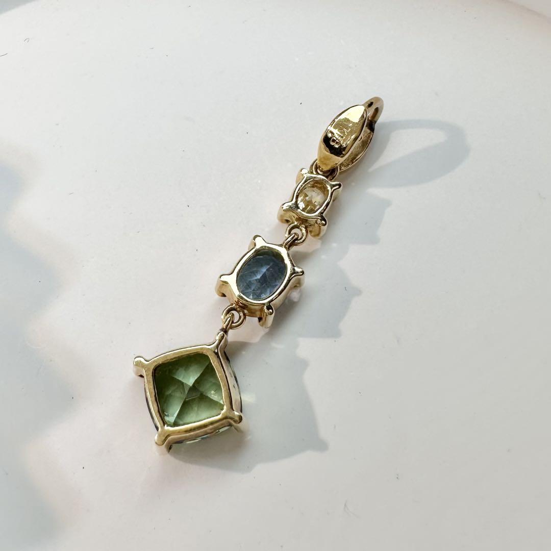 希少石デマントイドガーネットを贅沢に使用した、K18イエローゴールド製のペンダントトップです。鮮やかなグリーンカラーのデマントイドガーネット(1.27ct)をメインに、ブルートパーズと上質なダイヤモンドがあしらわれた、ラグジュアリーで華やかなデザインとなっております。デマントイドガーネットは、ガーネットの中でも特に稀少性が高く、美しい輝きと力強い緑色が特徴です。動くたびに光を反射し、胸元を華やかに彩ります。