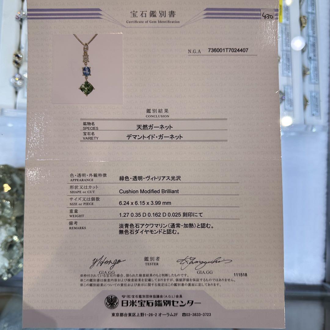【K18】デマントイドガーネット1.27ct サンタマリアアクア ペンダント