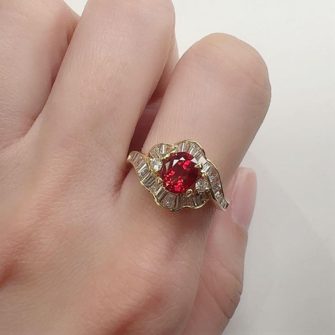 鮮烈な赤が美しく輝く、K18製レッドスピネル 1.13ct リングです。透明感があり、内側から燃えるように輝く発色が大変魅力的な一石です。周囲にはテーパーバゲットカットダイヤモンドを贅沢にセッティング。波打つような立体的デザインが華やかさを一層引き立て、クラシカルで高級感のある仕上がりになっています。ゴールドの温かみとレッドスピネルの鮮やかな色合いが絶妙に調和した、存在感のあるリングです。