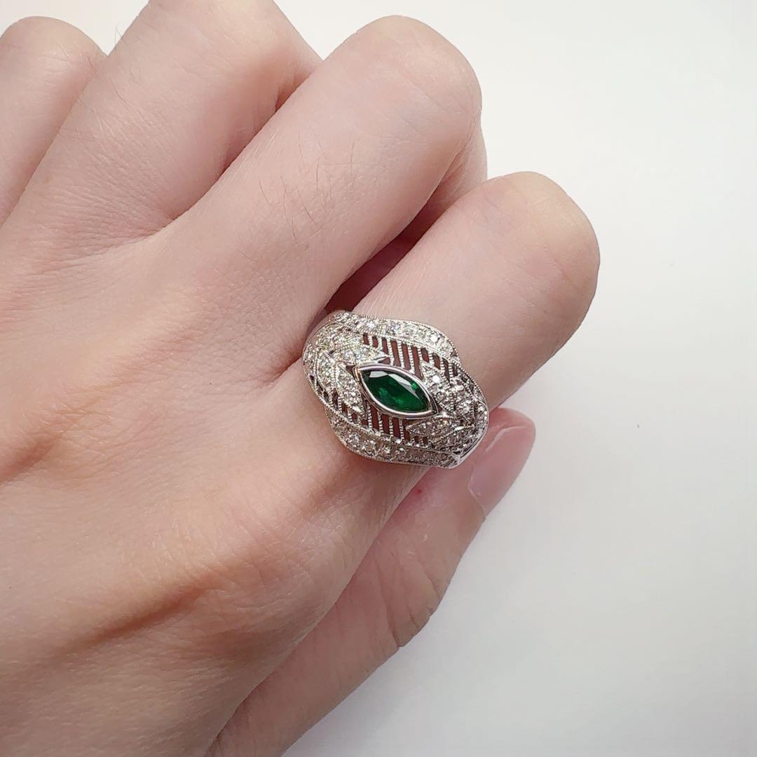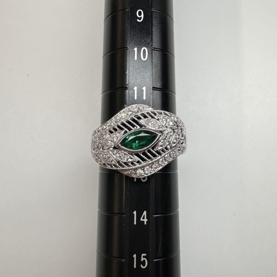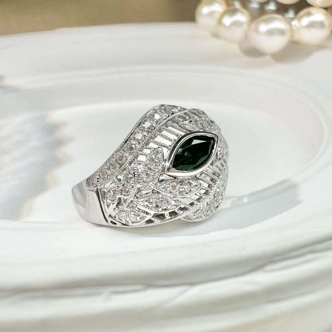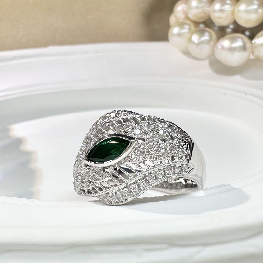 K18ホワイトゴールドに0.36カラットのエメラルドを中央に配し、周囲をダイヤモンドで取り巻いた華やかなリングです。深いグリーンのマーキスカットエメラルドが上品に輝き、繊細な地金細工が高級感を引き立てます。特別な日やフォーマルな装いにふさわしいデザインです。